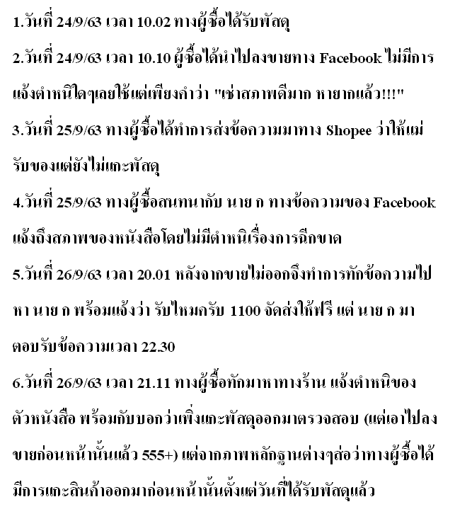 คือลูกค้าซื้อสินค้าแล้วนำไปเปิดประมูลในกลุ่ม Facebook หลังจากได้รับสินค้าทันที (วันที่ 24/9/63) แต่ไม่มีคนสนใจ จนขายไม่ออกแล้วมาอ้างกับผมทางการสนทนาว่าเพิ่งแกะสินค้าออกมาวันที่ (26/9/63) เพื่อจะทำเรื่องขอคืนเงิน