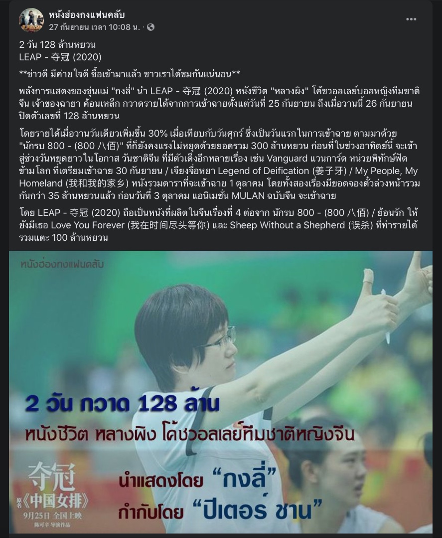 "Leap ตบให้สนั่น" ภาพยนตร์สร้างจากเรื่องจริง ทำรายได้ทะลุ 3,500 ล้านบาทเปิดตัวโค่นหนังฟอร์มยักษ์ที่ทำรายได้สูงสุดของปี นำแสดงโดยราชินีแห่งวงการภาพยนตร์จีน “กงลี่” ที่ได้ ปีเ