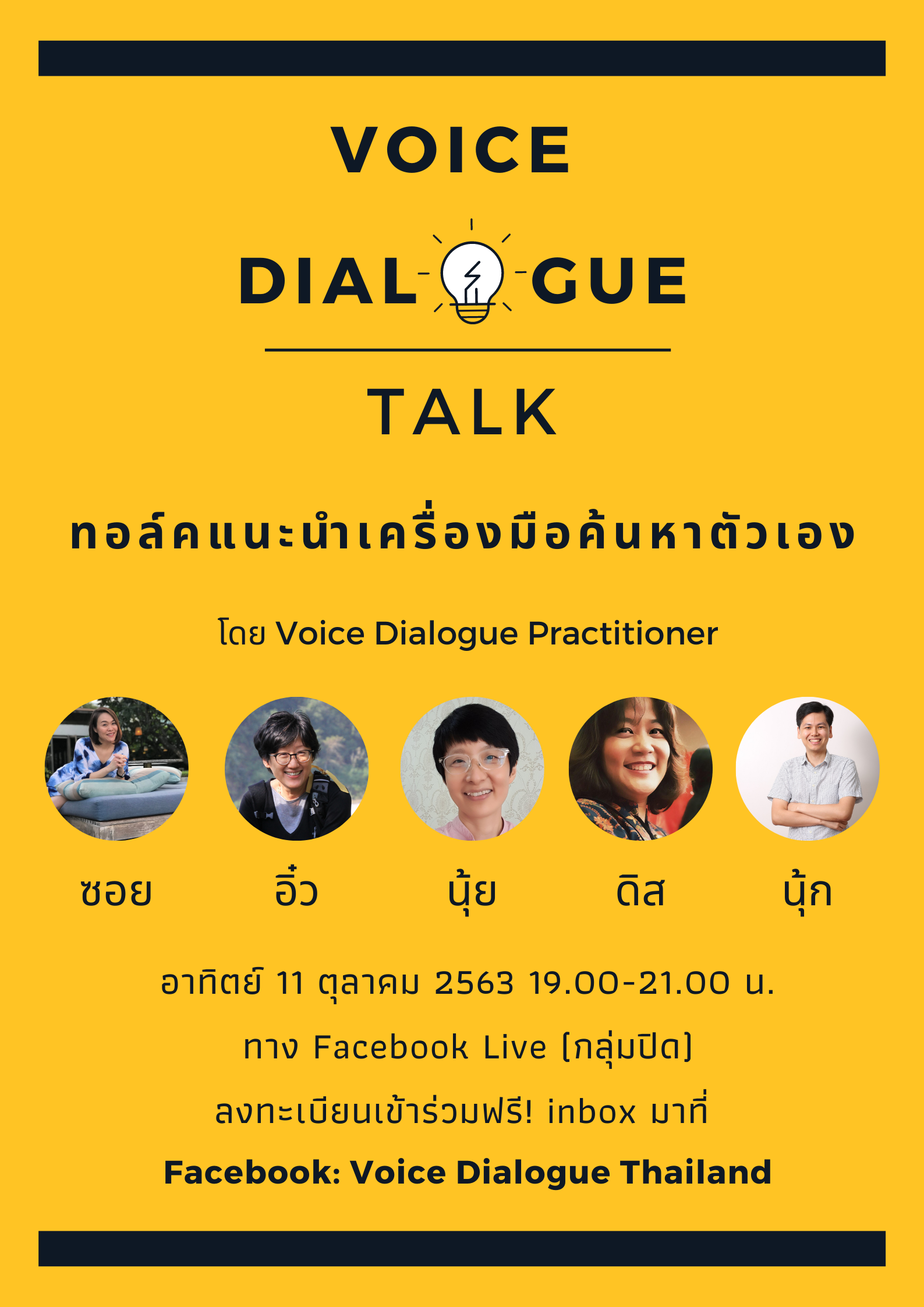 งานทอล์คสบายๆ แนะนำเครื่องมือการรู้จักเข้าใจตัวเองที่มีชื่อว่า "Voice Dialogue" โดย ครู Facilitator และ เพื่อนๆ พี่ๆ น้องๆ ที่ใช้เครื่องมือนี้พัฒนาตัวเอง ดูแลความสัมพันธ์ และ ฝ่าฟันอุปสรรค ในชีวิตประจำวัน