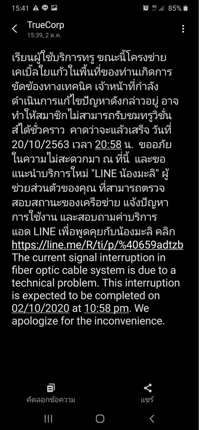 ตาม sms แจ้งมาและในขณะนี้ก็รับชม true visions ไม่ได้แล้ว คิดว่าระยะเวลาซ่อม/ซ่อมบำรุงค่อนข้างทำให้ลูกค้าทรูวิชั่นเสียโอกาสการรับชม น่าจะมีมาตรการชดเชยให้ลูกค้าคืนในส่วนที่พลาดไปครับ ถ้าต้องจ่ายค่าบริการเต็มนี่คงรู้สึกกังขากับการจ่ายพอสมควรครับ