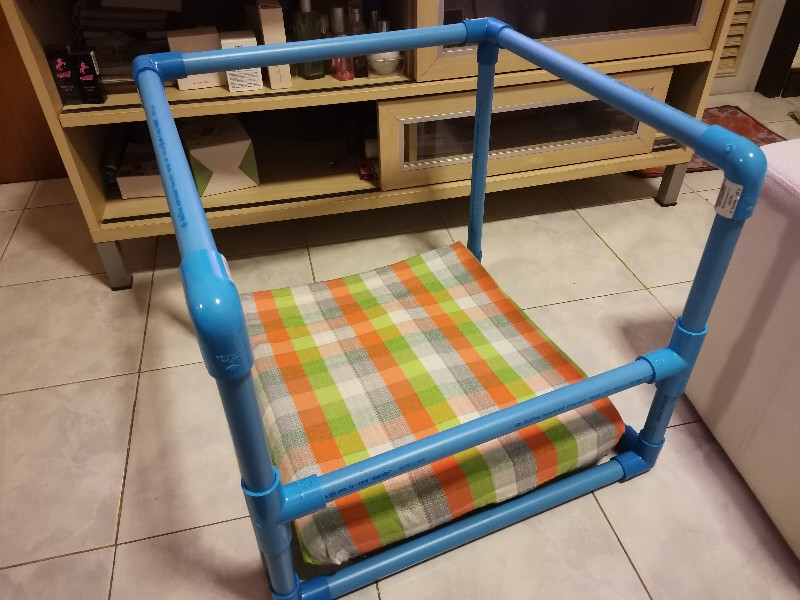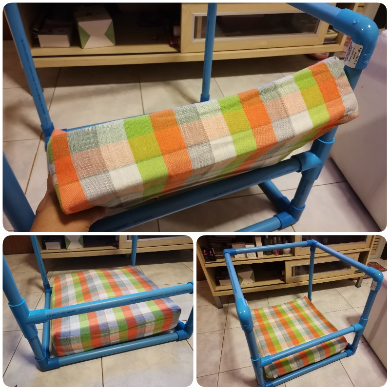 คราวนี้ก็มานึกว่า จะใช้อะไรทำผนังคอกดี เลือกอยู่นานเลยค่ะ สรุปที่ผ้ายัดไยค่ะ แต่แผ่นล่างเพิ่มพลาสติกก้นกระเป๋าไปด้วยค่ะ ให้แข็งหน่อย ต้องทำเป็นเชือกผูกไว้ เพราะไม่อยากใช้น้ำยาประสานท่อ หรือ ขันน๊อตค่ะ เผื่อใช้เสร็จก็จะได้สามารถรื้อได้ค่ะ