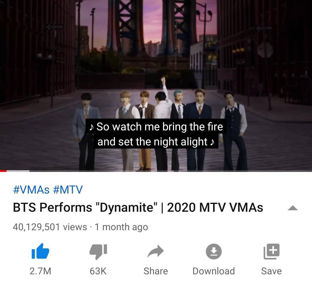 [BTS]Dynamite performance 2020 ในงานMTV VMAs มียอดวิวทะลุ 40M ล้านวิวบน YouTube 🧨💥