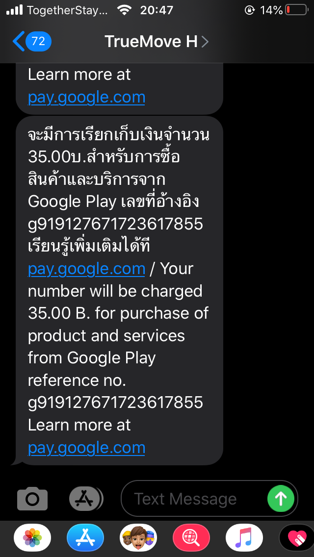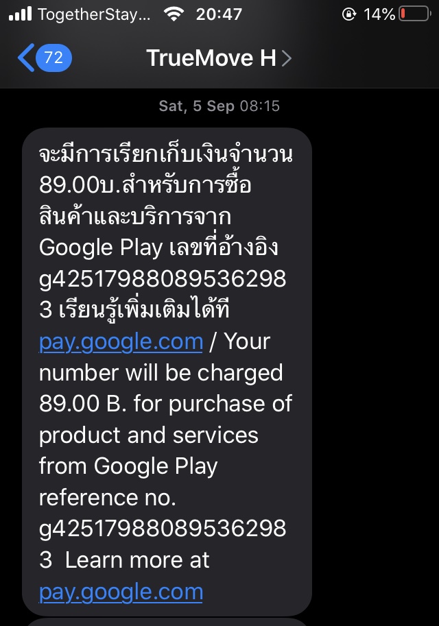 แต่เมื่อวันที่ 31/9/63 ผมกำลังจะจ่ายเงินผ่าน App KTBank ด้วยมือถืออีกเครื่อง ขึ้นยอดเรียกเก็บที่ 794 บาท จึงทำให้มีข้อสงสัยและได้ติดต่อเจ้าหน้าที่ True หมายเลข 1242 ทางเจ้าหน้าที่แจ้งว่าเป็นการเรียกเก็บเงินจากทาง Google pay. เมื่อวันที่ 4-5/9/63 และให้ข้อมูลอีกว่ามีลักษณะเหมือนกันเติมเงินเกมส์ออนไลน์ และให้เข้าไปติดต่อเจ้าหน้าที่ที่ศูนย์ทรู เพื่อข้อมูลเพิ่มเติม