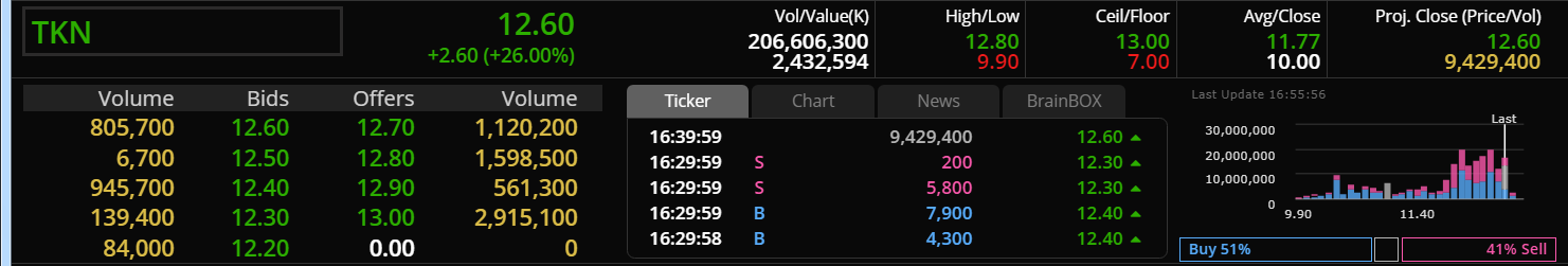 ด้วยปริมาณ 2,432.594 ล้านบาท และ ราคาปิด 12.60 (+ 2.60 หรือ 26.00%) เกือบชนลิ่ง ปลุกเร้าทั้งวันถึงไม้สุดท้ายด้วยปริมาณ 9,429,400 หน่วย เป็นจำนวนเงิน 118.81 ล้านบาท