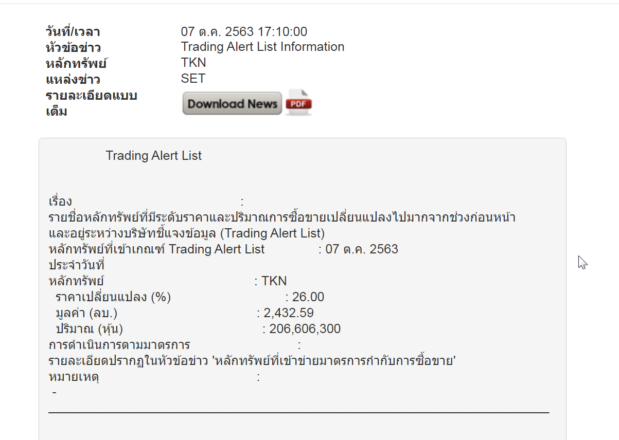 TKN : เข้าคุก Cash เริ่มวันนี้ 8/10/2563 ภายใต้มาตรการ Trading Alert