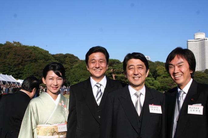 ตระกูลอาเบะและตระกูลคิชิคือครอบครัวนักการเมืองชั้นอำมาตย์มาตั้งแต่ยุคก่อนสงครามโลก ปู่ของชินโซ อาเบะคือ คัน อาเบะ เป็นสส. ตั้งแต่ปี 1937-1946 ตาของเขาคือ โนบูซูเกะ คิชิเป็นอดีตนายกรัฐมนตรีญี่ปุ่น ผู้มีบทบาทอย่างสูงในการยึดครองจีน เกาหลีและแมนจูเรีย เคยถูกดำเนินคดีในข้อหาอาชญากรสงครามหลังสงครามโลกสิ้นสุด