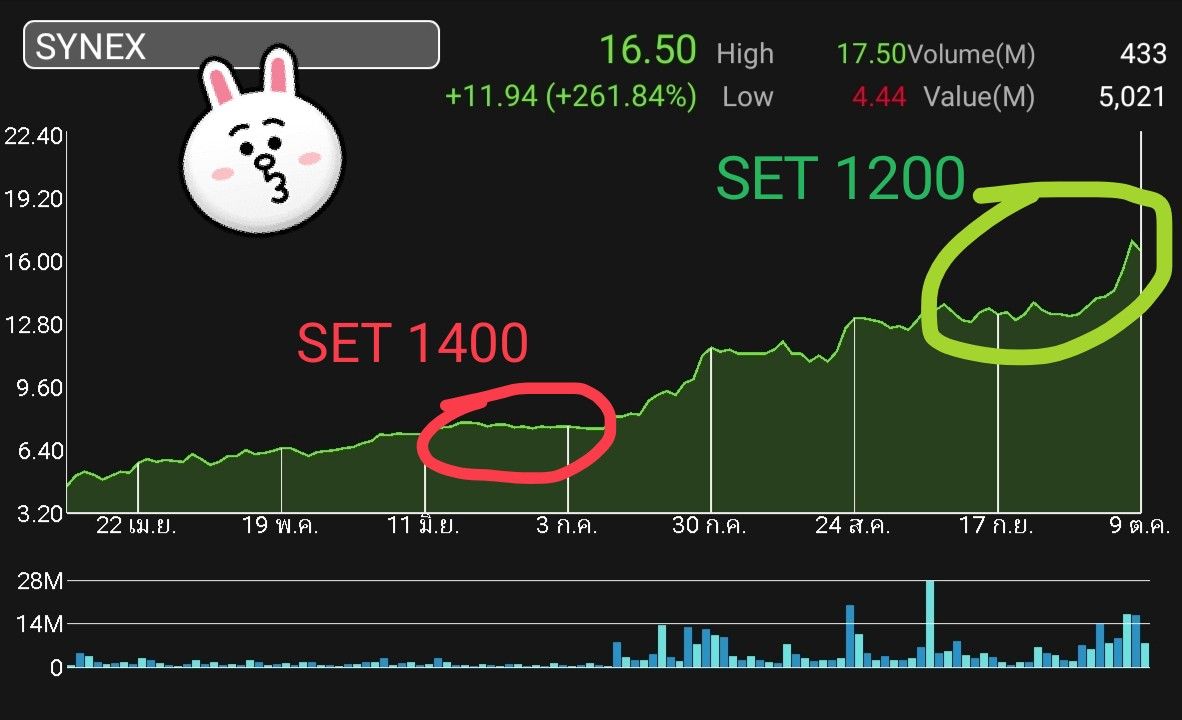 ยกตัวอย่าง หุ้นหลายตัวเนี้ยยย ตอนเซต1400 มาจนเซต 1200 เซตลงมา-200จุด แต่ราคามันขึ้นมาเป็นเด้งๆ เป็นเท่าตัว!!