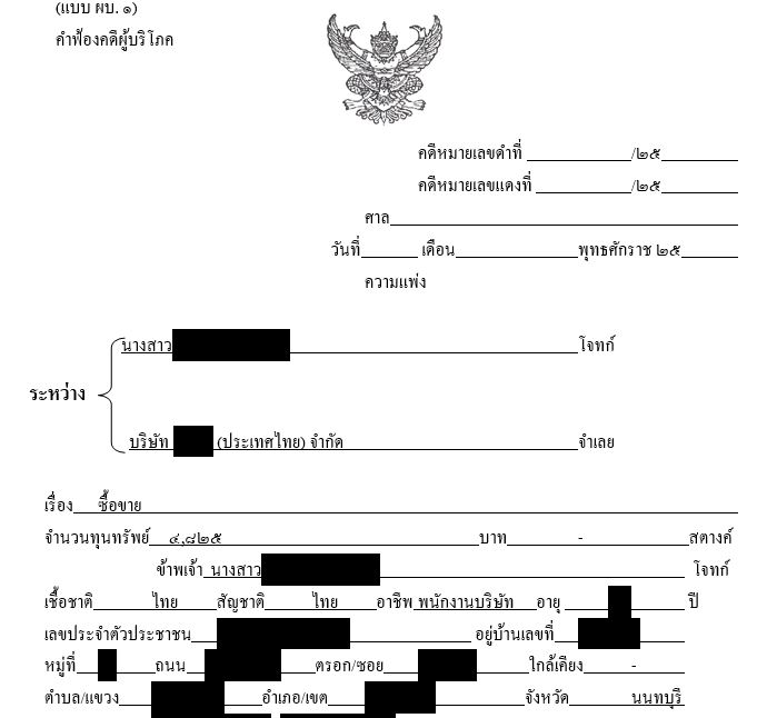 แบบฟอร์มคดีผู้บริโภค ร่างไปก่อนเพื่อความรวดเร็ว เมื่อไปศาลจะมีเจ้าหน้าที่จัดการคำร้องให้เป็นไปตามเอกสารราชการอีกครั้ง (ใช้เวลา 1-2 สัปดาห์)