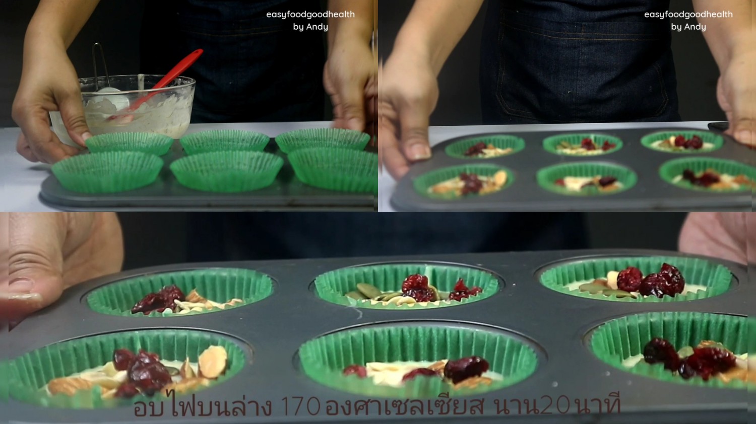 ตักใส่พิมสำหรับอบ แอนใช้พิมมัพฟิ่นขนาด6ชิ้น โรยหน้าด้วยธัญพืชอบแห้ง