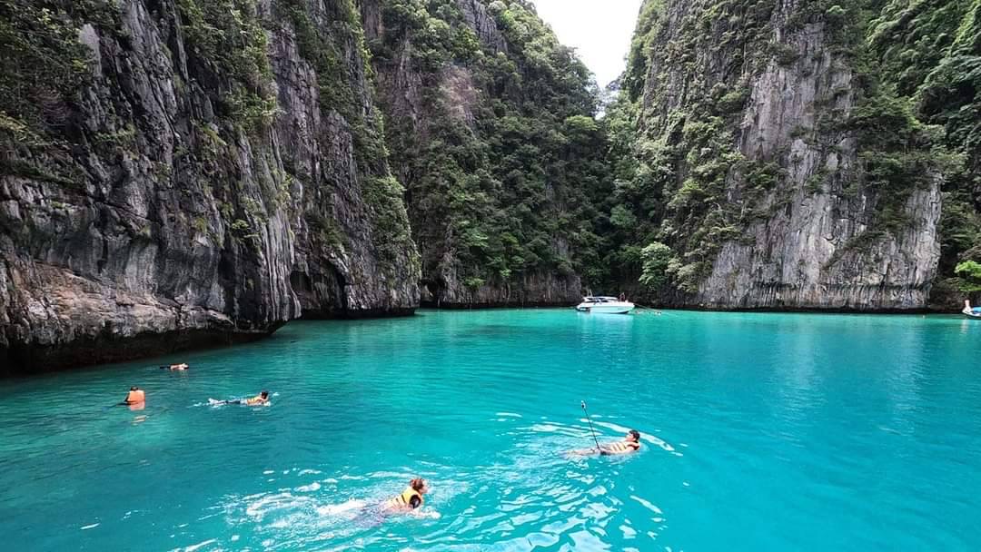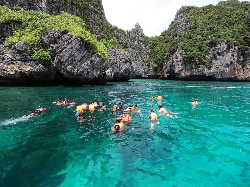 วันที่ 2 ต้องตื่นเช้าหน่อย ทัวร์นัดตั้งแต่เจ็ดโมงครึ่ง วันนี้เริ่มเที่ยวกันที่เกาะพีพี นั่งเรือแวะตามหาดต่าง ๆ (แน่นอนว่าจำชื่อไม่ได้) ทำกิจกรรม เล่นน้ำตามใจชอบ บรรยากาศดีเลย ฟ้าฝนเป็นใจ แถมคนก็ไม่เยอะมาก ถึงเกาะมีบุฟเฟ่ที่ร้านอาหารให้กินด้วย
