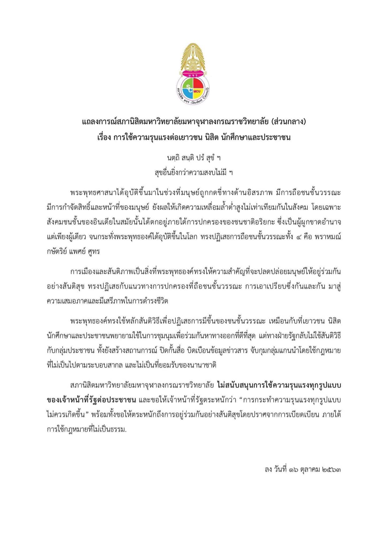 แถลงการณ์จากสภานิสิตมหาวิทยาลัยมหาจุฬาลงกรณราชวิทยาลัยนะโยม