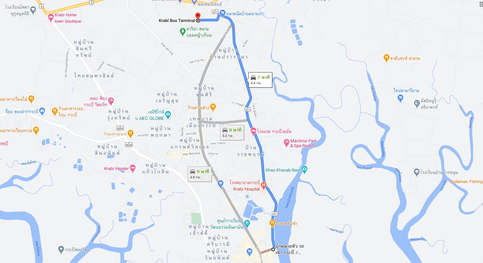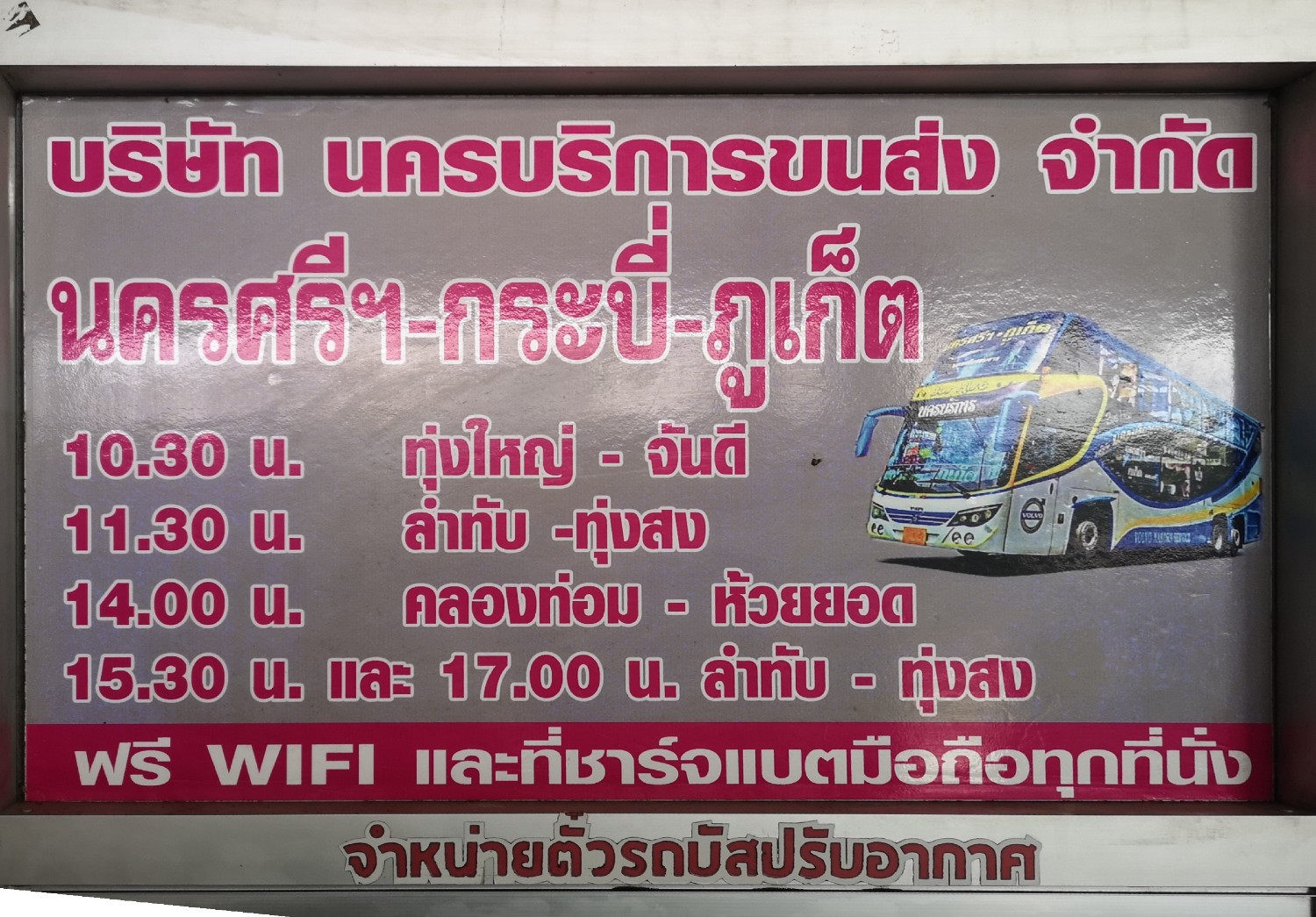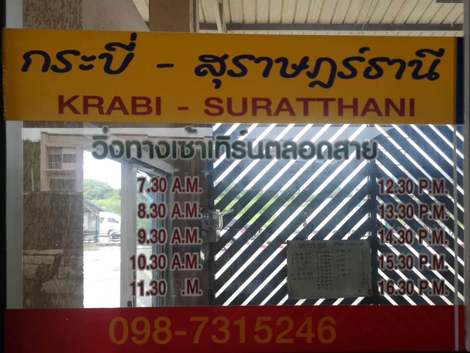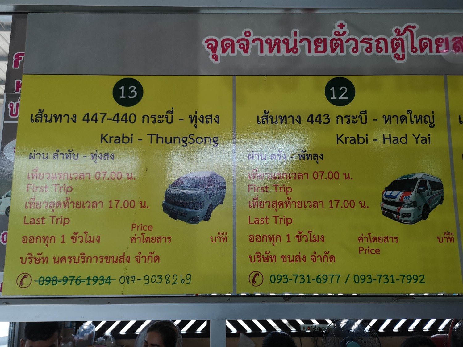 ก่อนนั่งรถสองแถวสีเหลืองเข้าไปในตัวเมืองกระบี่เพื่อไปยังร้านเช่ารถมอเตอร์ไซค์ ผมก็เดินสำรวจดูรถบัสและรถตู้ที่วิ่งไปจังหวัดใกล้เคียงแถบนี้ก็เห็นว่ามีรถหลายบริษัทและวิ่งกันหลายรอบทั้งไปภูเก็ต สุราษฎร์ธานี นครศรีธรรมราช เกาะลันตา ตรัง และหาดใหญ่ เรียกว่าหากเราเที่ยวต่อเนื่องจังหวัดใกล้กันก็สามารถนั่งรถต่อไปได้ง่าย