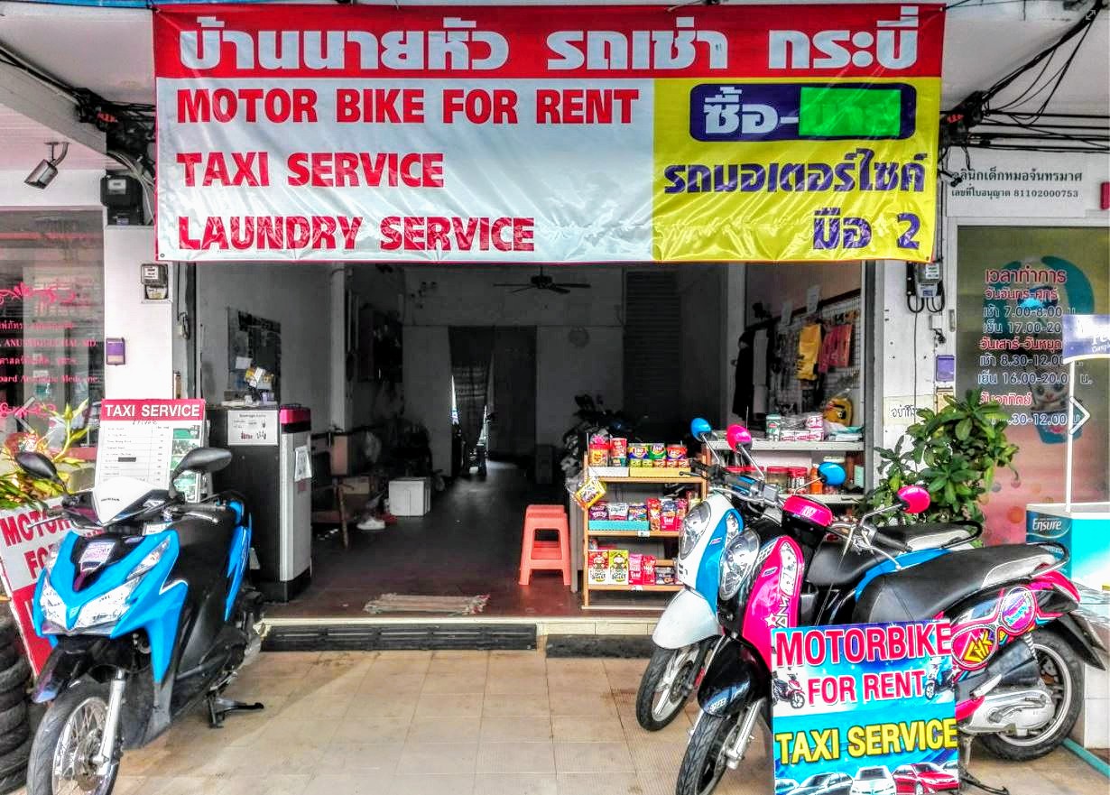 นอกจากที่ บขส. กระบี่จะมีร้านอาหารให้นั่งทานด้านในสถานีแล้ว ยังมีร้านเช่ารถมอเตอร์ไซค์อยู่ที่นี่ด้วย หากใครสนใจอยากขี่รถมอเตอร์ไซค์เที่ยวก็สามารถลงรถบัสที่นี่แล้วเช่ารถเที่ยวต่อได้เลย เสียดายว่าก่อนมาที่นี่ผมได้โทรจองรถเช่าไว้กับทางร้านในตัวเมืองกระบี่ไว้แล้ว