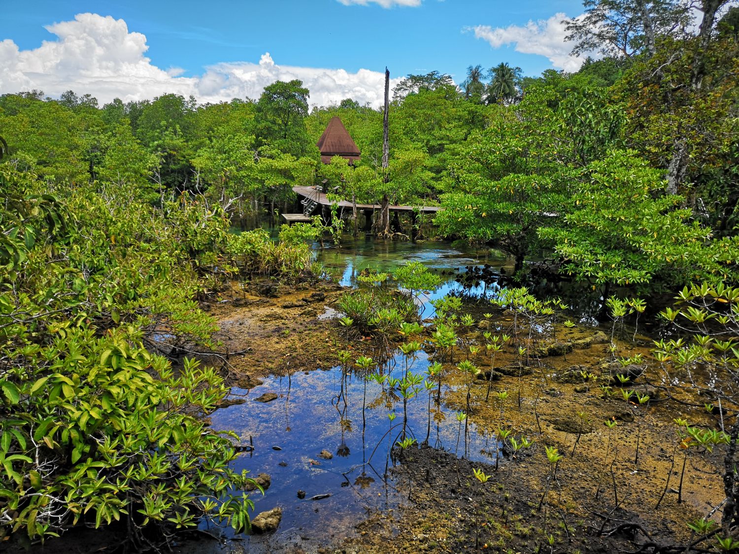 ท่าปอมคลองสองน้ำเป็นแหล่งท่องเที่ยวเชิงนิเวศน์วิทยาที่ได้รับการยกย่องให้เป็น 1 ใน Unseen Thailand ลักษณะเป็นป่าพรุน้ำกร่อยกับป่าชายเลนที่อุดมสมบูรณ์ พืชพรรณธรรมชาติของป่าแห่งนี้อาศัยคลองสองสายที่มีระบบน้ำจืดผสมกับน้ำทะเล ต้นไม้ในผืนป่าโดดเด่นที่มีรากโผล่บนน้ำขึ้นมาหายใจ สีน้ำเขียวอมฟ้าดูใสและสะท้อนยามเมื่อต้องแสงแดด เป็นภาพชวนฝันที่ใครหลายคนอยากมาเห็นกับสายตาของตนเองสักครั้งเมื่อมาเที่ยวสถานที่แห่งนี้