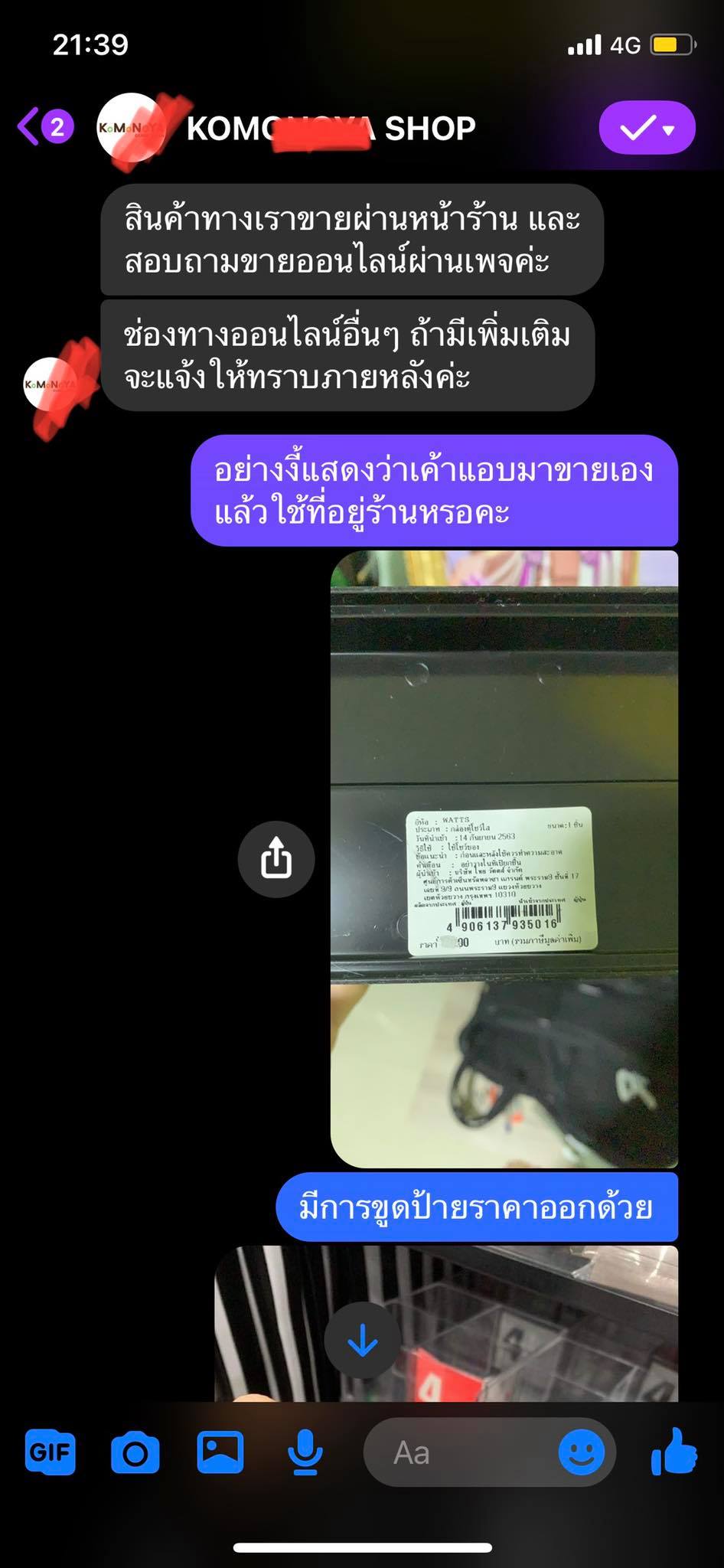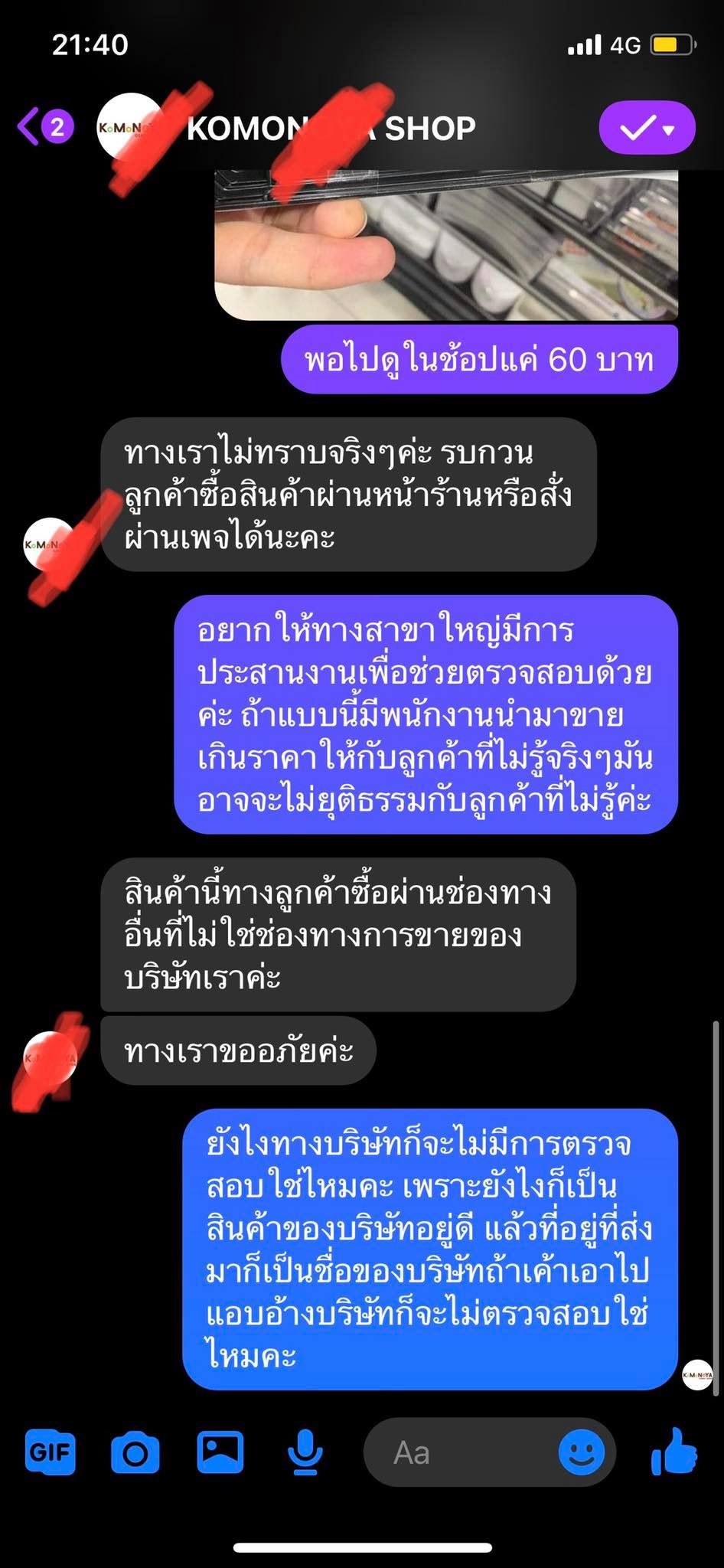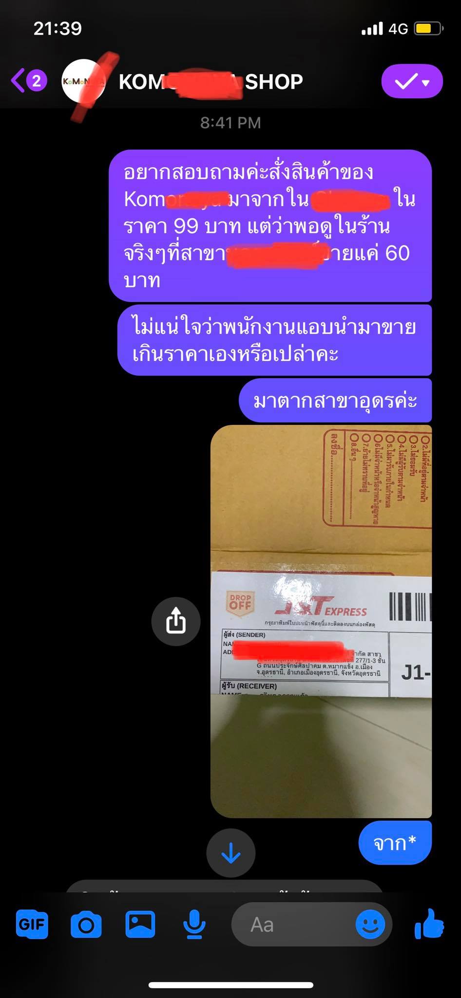 หลังจากกลับมาจากร้านเลยไปถามในเพจว่ามีพนักงานแอบเอาของมาขายข้างนอกเองแบบเกินราคาหรือเปล่า ที่สงสัยพนักงานเพราะว่าที่อยู่ที่ส่งมาเป็นชื่อบริษัทพร้อมสาขาที่ส่งมาแล้วสินค้าส่วนใหญ่ที่ลงขายก็เป็นสินค้าของร้านนี้หมดเลย ราคาของสินค้าส่วนใหญ่ที่ลงขายจะเป็น 99 บาทหมดแต่ราคาปกติ 60 บาท เรารู้สึกว่ามันไม่แฟร์กับลูกค้าที่เค้าไม่รู้ เพราะถ้าเค้ารู้เค้าก็จะสามารถไปซื้อในราคาปกติได้ที่ไม่ได้แพงขนาดนี้เลยอยากให้ทางสาขาใหญ่ช่วยตรวจสอบแต่สิ่งที่เพจตอบกลับมาทำให้ผิดหวังอย่างมากค่ะ
