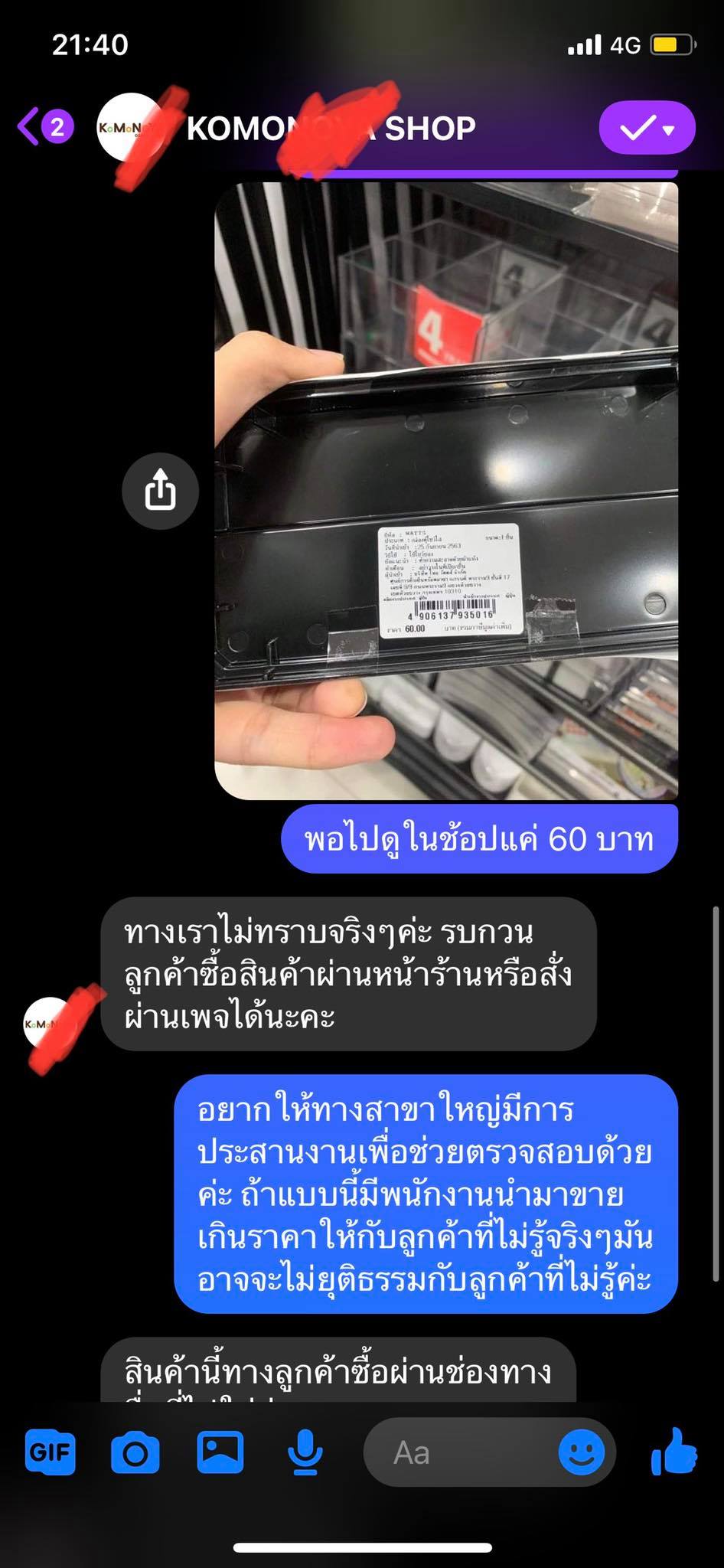 เราไม่ได้ต้องการให้เค้ารับผิดชอบอะไรเพราะเราซื้อของมาจากร้านอื่นจริงแค่ต้องการให้ตรวจสอบว่าถ้ามีพนักงานนำของมาขายเกินราคาจริงควรให้พนักงานหยุดฉวยโอกาสจากผู้บริโภคที่ไม่รู้ เพราะพนักงานทำงานก็ได้เงินเดือนอยู่แล้ว ไม่อยากให้คนอื่นที่ไม่รู้ต้องเสียเงินเยอะกว่าเดิมโดยใช่เหตุแบบเราแล้วร้านนั้นขายไปแล้วเป็นร้อยๆชิ้น ยกตัวอย่างเคสอย่างบริษัทเก่าเรามีคนในที่ทำงานแอบนำของไปขายเกินราคาให้ลูกค้าเอาส่วนต่างเข้าตัวเองโดยที่บริษัทไม่รู้ สุดท้ายพอบริษัทจับได้เลยยังโดนให้ออกเลย ถ้าทางร้านนี้ไม่มีการตอบกลับอะไรมาแล้วเราจะถือว่าเค้าไม่ได้สนใจฟังเสียงของผู้บริโภคเลยแม้แต่นิดเดียว เน้นแค่ว่าขายได้ก็จบห่วงแค่ขายของแต่ไม่ได้ฟังเสียงลูกค้า สุดท้ายนี้เราคงไม่ซื้อของร้านนี้อีกแล้วค่ะ