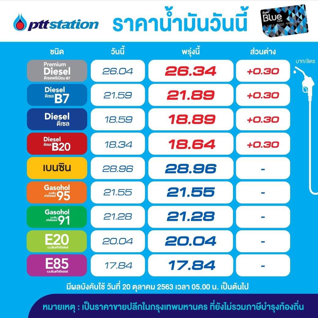 โดยน้ำมันกลุ่มดีเซลไม่ว่าจะเป็น พีทีที อัลตร้าฟอร์ซ ดีเซล, พีทีที อัลตร้าฟอร์ซ ดีเซลพรีเมียม B7, พีทีที อัลตร้าฟอร์ซ ดีเซล B7 และ พีทีที อัลตร้าฟอร์ซ ดีเซล B20 ปรับขึ้น 30 สตางค์/ลิตร ส่วนน้ำมันกลุ่มเบนซิน ราคาคงเดิม มีผลวันพรุ่งนี้ (20 ต.ค. 2563) ตั้งแต่เวลาตี 5 เป็นต้นไป