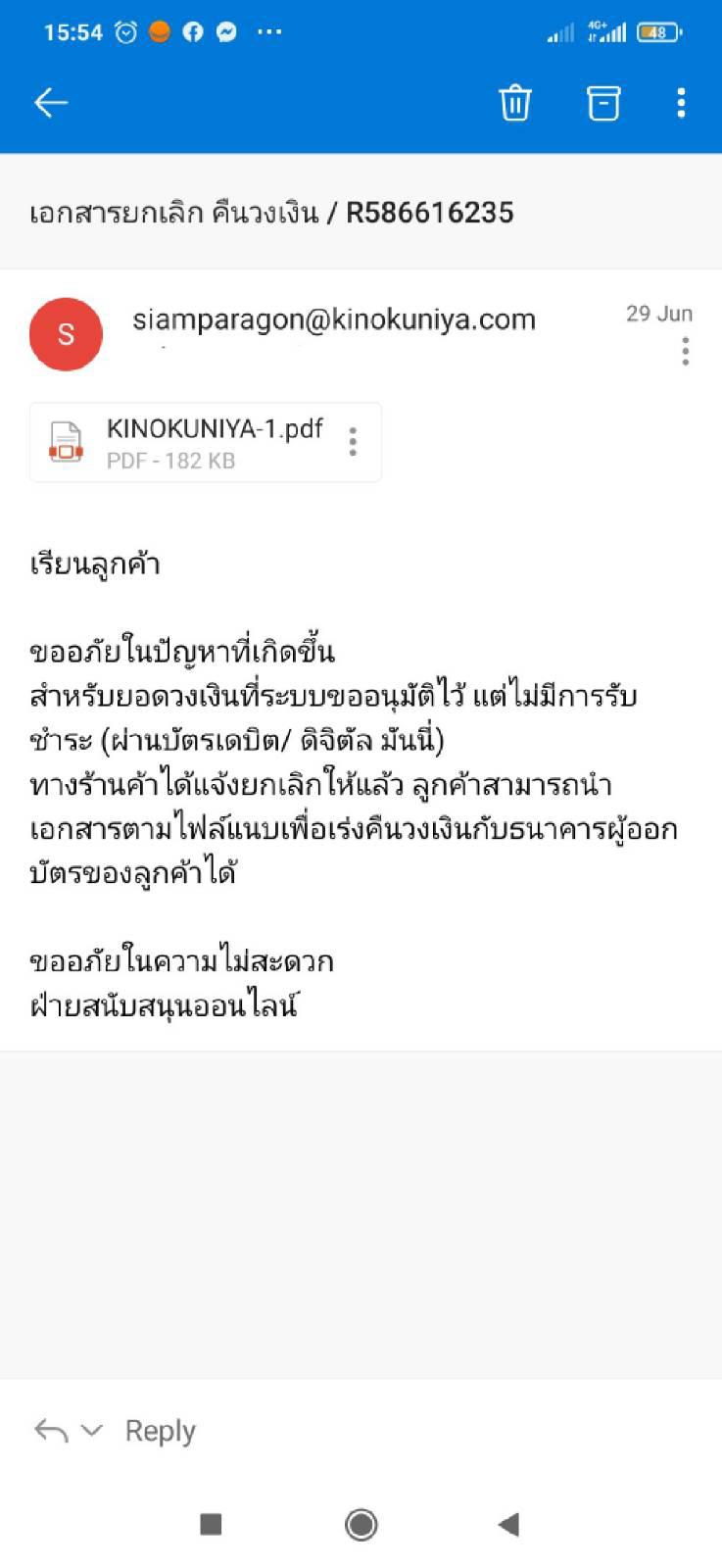 ต่อมาในวันที่ 29มิถุนายน2563 ทางคิโนะได้แจ้งเรามาว่าให้โอนเงินจำนวนเดิมเข้าไปอีก เราจึงถามเขาไปว่าเงินที่เคยโอนมันหายไปไหน ทางนั้นก็บอกว่าที่ให้โอนครั้งแรกเพื่อเช็คยอดแล้วจึงโอนเงินกลับมาให้เรา แต่เรายังไม่ได้รับเงินก้อนแรกที่โอนไปทางคิโนะจึงส่งหลักฐานการคืนวงเงินให้เราไปดำเนินการคืนเงิน