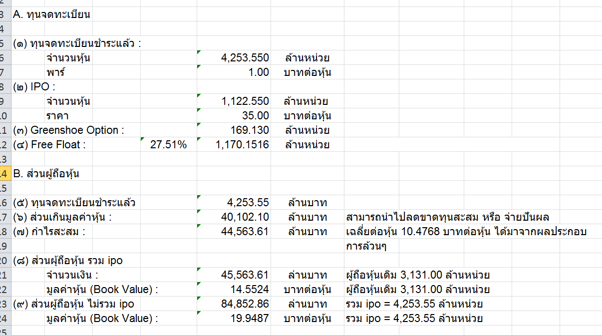 A. ข้อมูล https://www.set.or.th/dat/news/202010/20114800.pdf ขอสรุปบางส่วนดังนี้ B. ทุนจดทะเบียน (๑) ชำระแล้ว : 340,000,000 หน่วยๆ(พาร์) 0.50 บาท (๒) Free Float : 54.20% (๓) IPO : 1