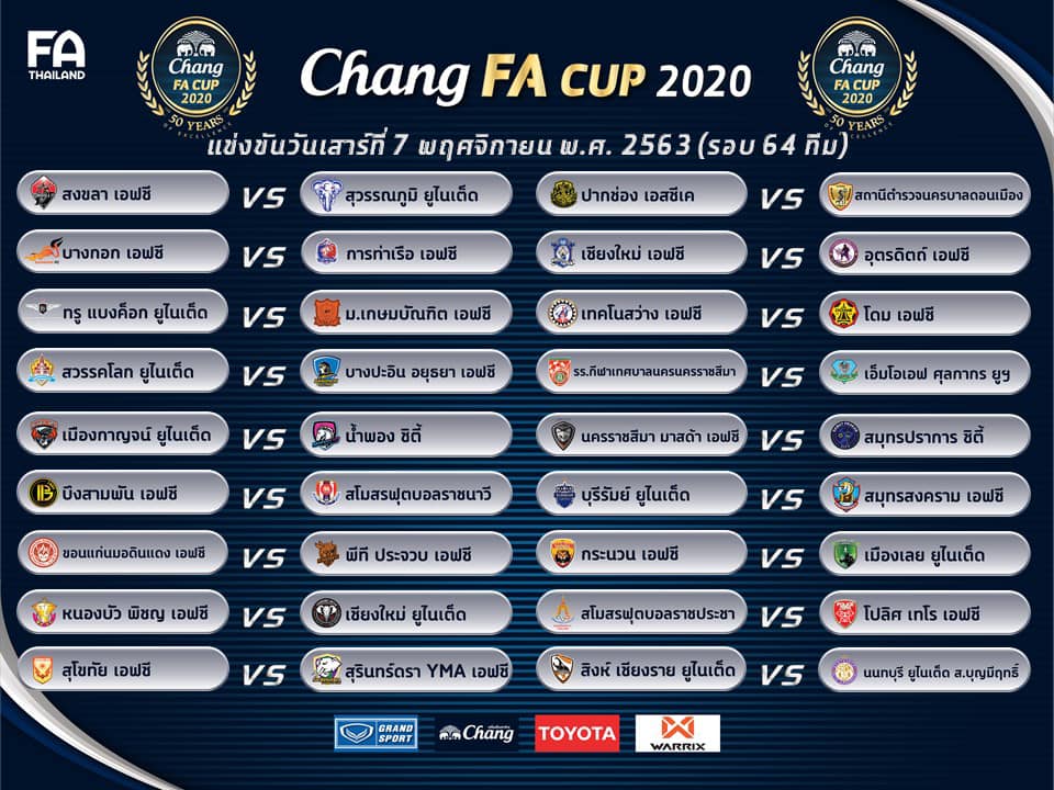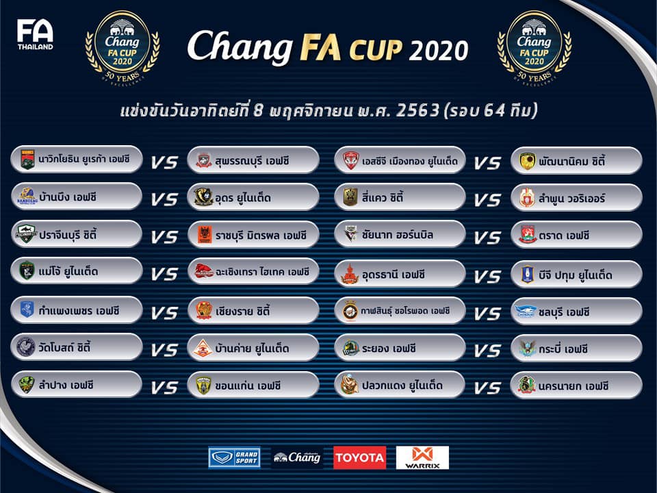 ผลการจับสลากฟุตบอลช้าง เอฟเอ คัพ รอบ 64 ทีมสุดท้าย มีดังต่อไปนี้