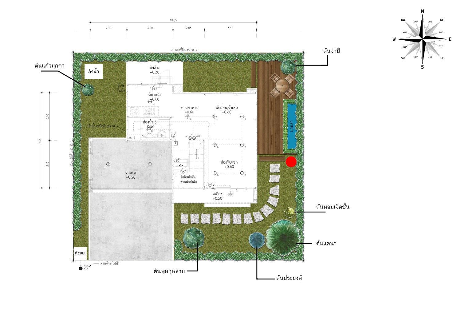 ปรึกษาเรื่องตำแหน่งการลงต้นไม้ตรงจุดสีแดงครับ พื้นที่ตรงระเบียงไม้นั้นมีอยู่ราว ๆ 4 เมตร แต่ตำแหน่งที่ลงมันจะค่อนข้างใกล้แนวรั้ว