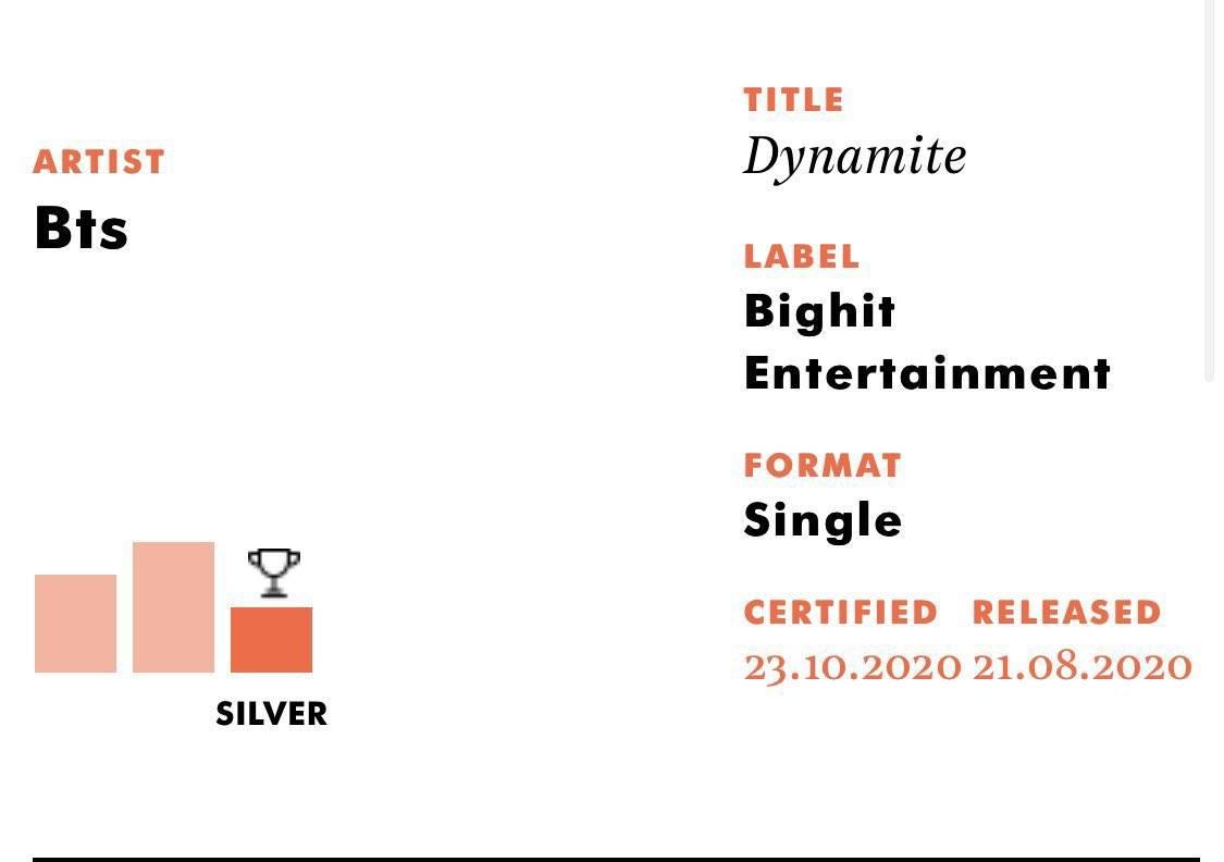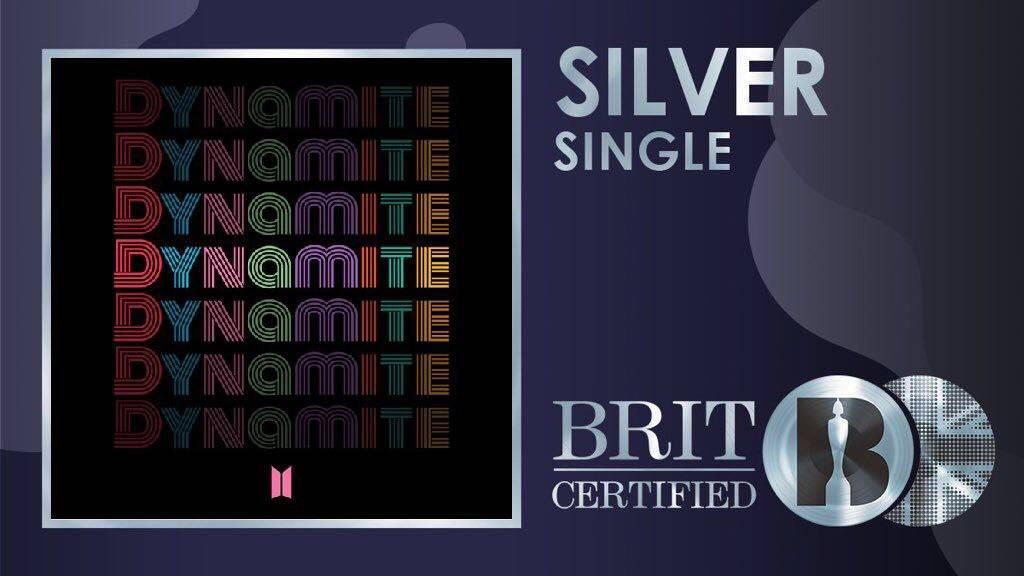 🔸เพลง Dynamite ได้รับการรับรองระดับ Silver ภายในเวลาเพียง 2 เดือนหลังจากเพลงปล่อย นับเป็นสถิติใหม่ที่เร็วที่สุดของวง 💿🇬🇧