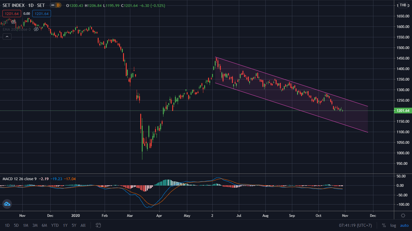 SET Index TF Day: ในภาพใหญ่ ดัชนียังคงเคลื่อนไหว Sideways Down ภายในกรอบ Downtrend Channel เหมือนเดิม แต่ถ้าหากซูมเข้ามาไกล้ๆ หลายวันที่ผ่านมา ดัชนีเคลื่อนไหวภายในกรอบ 1195 – 1223 จุด โดยการเคลื่อนไหวของแท่งเทียนอยู่ในลักษณะ “High Wave” ซึ่งคาดว่า