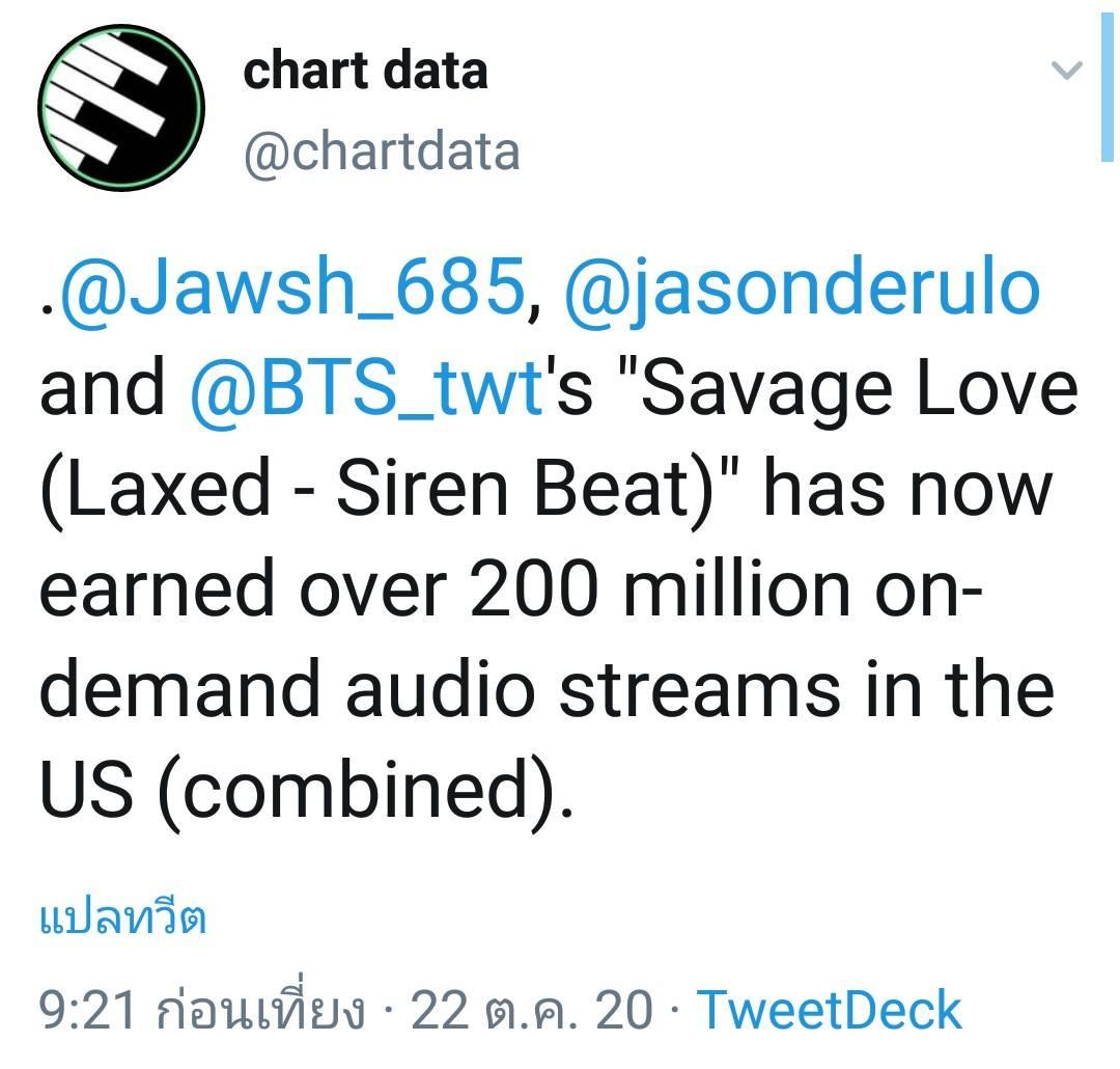 เพลง 'Dynamite' ของ BTS มียอดสตรีมผ่าน 300 ล้านสตรีมบน Spotify 'Dynamite' เป็นเพลงที่มียอดสตรีมถึง 300 ล้านสตรีมเร็วที่สุดของศิลปินเกาหลี โดยใช้เวลาเพียง 59 วันนับตั้งแต่ปล่อยเพลง *สัปดาห์นี้ลุ้นอันดั