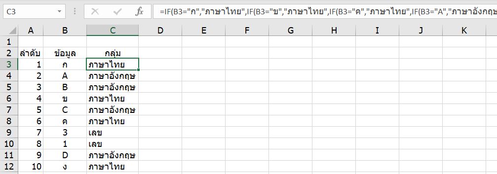 =IF(B4="ก","ภาษาไทย",IF(B4="ข","ภาษาไทย",IF(B4="ค","ภาษาไทย",IF(B4="A","ภาษาอังกฤษ",IF(B4="B","ภาษาอังกฤษ",0)))))........