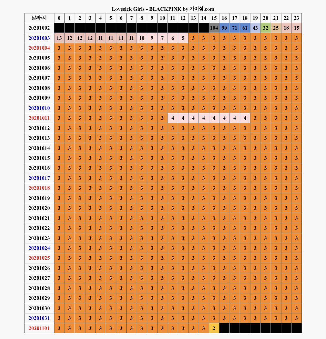 ณ เวลา 15:00 KST เพลง Lovesick Girls จาก BLACKPINK ได้ทะยานขึ้นสู่อันดับ 2 ชาร์ต Melon 24Hits เป็นอันดับสูงสุด (New Peak) หลักจากปล่อยเพลงมาแล้ว 30 วัน จากก่อนหน้าที่อยู่อันดับ 3 Melon 24Hits มาร่วมเดือน ท่ามกลางสงครามชาร์ตเพลงและการปล่อยเพลงใหม่ของศิลปินดังมากกมาย และเพลงนี้สามารถทำยอดคนฟังไม่ซ้ำไอดี ULs(Peak) ไว้ที่ประมาณ 520k+ และจากการปล่อยเพลงมาร่วมเดือนยอด ULs ยังคงอยู่ระหว่าง 400k-500k นับได้ว่าเป็นเพลงที่มียอดคนฟังเสถียรที่สุดในบรรดาเพลงทั้งหมดของ BLACKPINK และมียอดกดหัวใจผ่าน 120,000 heart !!