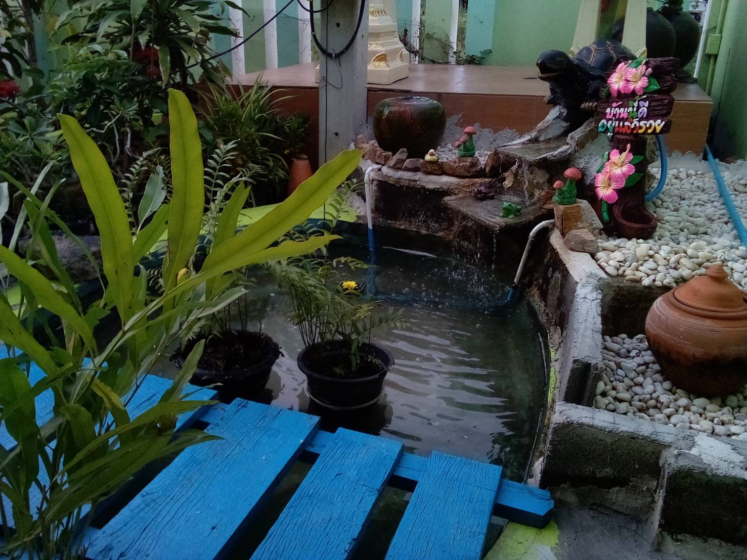 - น้ำตก ใช้กระเบืองปูพื้นเก่า เอามาทำเป็นน้ำตกสองชั้น เป็นตัวเพิ่มออกซิเจน