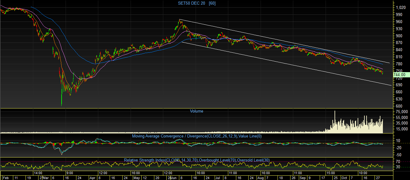 S50Z20 TF 60Min: หลายวันที่ผ่านมา ดัชนียังคงเผชิญกับแรงเทขายทำกำไรออกมาอย่างต่อเนื่อง และทำให้เกิดรูปแบบการร่วงลงมาเป็นลักษณะSideways Down ภายในกรอบ Downtrend Channel อย่างไรก็ตาม การที่ดัชนีร่วงลงมาต่อเนื่อง หลายวัน ทำให้ Indicator บางตัว เข้าสู่สภาวะ Over sold จึงคาดว่า แนวโน้มระยะสั้น มีโอกาสเกิด Technical Rebound แต่ถ้าหากไม่ฟื้นตัวใดๆเลย ก็อาจค่อยๆไถลลงมา ทดสอบกรอบแนวรับล่าง ก็เป็นได้