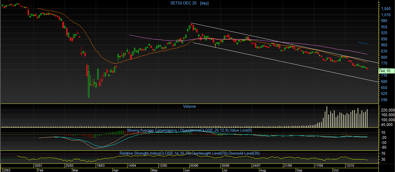 S50Z20 TF Day: ตลอดทั้งสัปดาห์ที่ผ่านมา ดัชนีเคลื่อนไหวในกรอบแคบๆ 734 – 761 จุด โดยรูปแบบการเคลื่อนไหว ยังคงอยู่ในลักษณะ Sideways Down ภายในกรอบ Downtrend Channel และดัชนียังคงทยอยทำ Lower Low “LL” จนลงมาปิด Gap บริเวณ 762 จุด ที่เคยเปิดทิ้งไว้ได้สำเร็จ อย่างไรก็ตาม การที่ดัชนีร่วงลงมาอย่างต่อเนื่อง ได้ทำให้ Indicator บางตัว เข้าสู่สภาวะ Oversold ซึ่งมีโอกาสที่จะเกิด Technical Rebound กลับขึ้นไปยืนเหนือ 760 จุด ได้อีกครั้ง แต่ถ้าหากไม่ฟื้นตัวใดๆเลย ก็อาจค่อยๆไถลลงมา ทดสอบกรอบแนวรับล่าง ก็เป็นได้