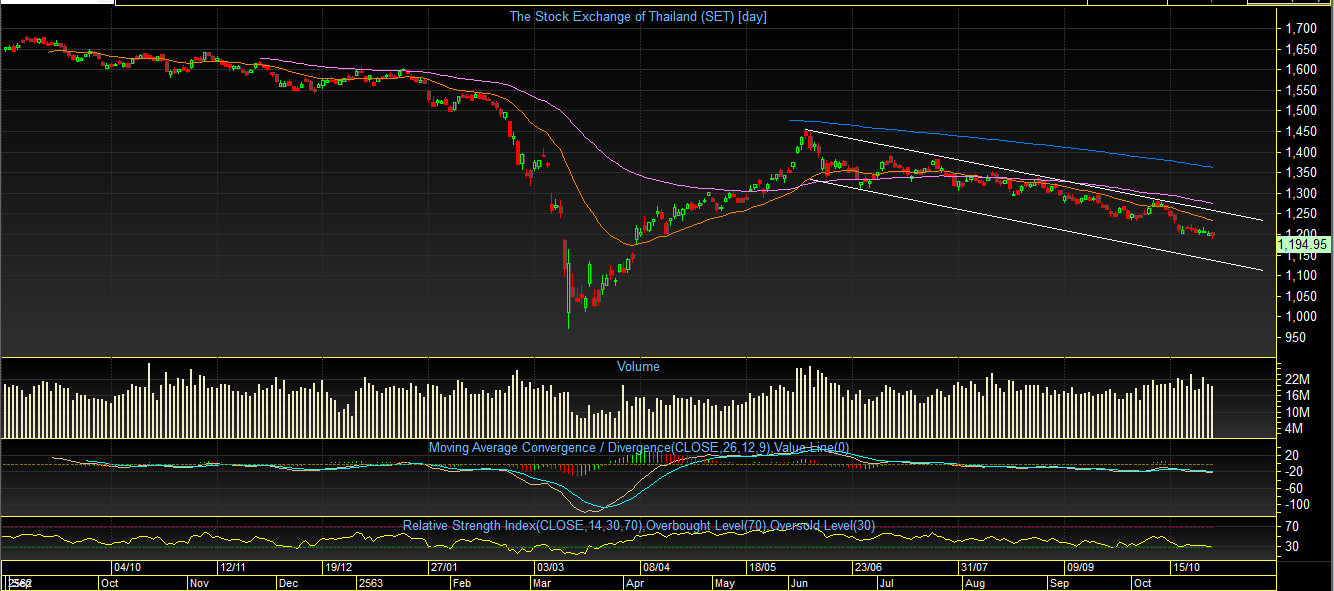 ตลอดทั้งสัปดาห์ที่ผ่านมา ดัชนีตลาดหุ้นไทย (SET Index) เคลื่อนไหวแกว่งตัวในกรอบแคบๆ (1187 – 1217 จุด) เนื่องจากมีปัจจัยความไม่แน่นอนหลายปัจจัย ไม่ว่าจะเป็นสถานการณ์การเมือง การชุมนุมภายในประเทศ และปัจจัยต่างประเทศ ก็คือ การเลือกตั้งประธนาธิบดีสหรัฐ ที่จะเกิดขึ้นในวันที่ 3 พฤศจิกายน นี้ แม้ว่าคะแนนโพลสำรวจจากหลายสำนัก ระบุว่า โจ ไบ เด็น คะแนนนำ โดนัล ทรัมป์ อยู่ก็ตาม แต่อะไรก็เกิดขึ้นได้ ดังนั้นนักลงทุนจึง Wait & See รอผลการเลือกตั้ง จึงจะตัดสินใจอีกครั้ง จึงทำให้เห็นการเคลื่อนไหวของดัชนีตลาดหุ้นอยู่ในกรอบแคบๆ และในวันศุกร์ ดัชนีปิดตัวไป ณ ระดับ 1194 จุด -6.69 จุด วันนี้มาติดตามกันต่อ ดัชนีจะสามารถฟื้นตัวได้หรือไม่