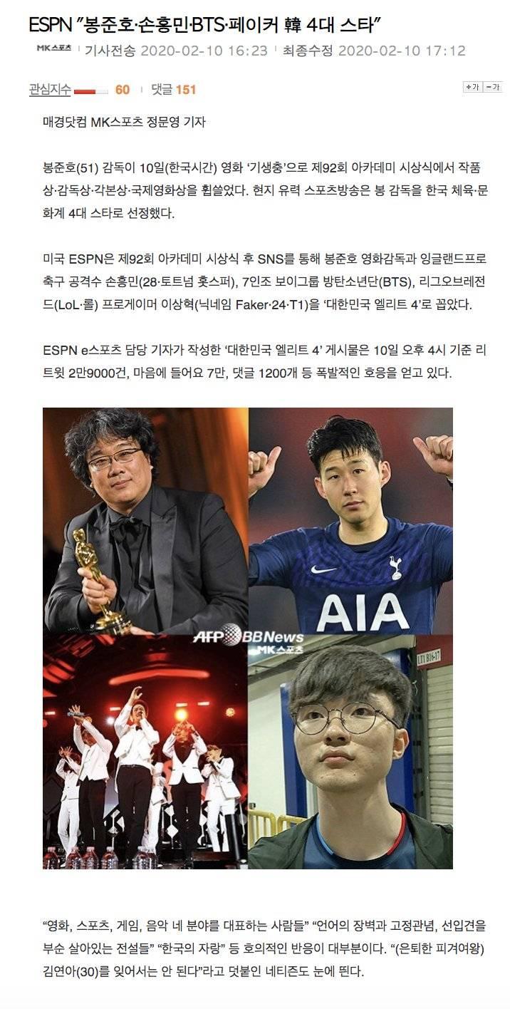 K-media: "Acc to US ESPN, Bong Joon-ho, BTS, Son Heung-min, & Faker are the 'South Korean Elite 4'. Responses include they're 'Korea's Pride', 'people who represent 4 fields of film, sports, games, & music', & 'living legends who broke language barriers, stereotypes & prejudice'"