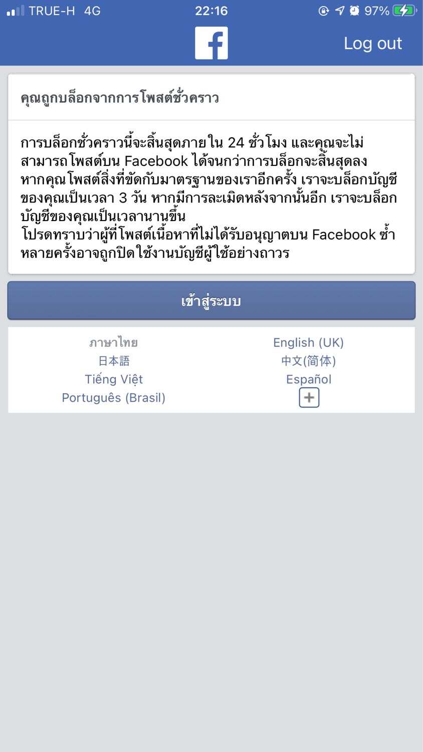 พอคลิกถูกใจ มันก็ขึ้นแบบนี้ ท่านใดมีวิธีแก้บ้างครับ ก่อนที่มันจะบล๊อกมันโชว์ว่า เซลซั่น หมดอายุ กำ.. คุณสมบัตินี้ถูกบล็อกชั่วคราว เมื่อเร็วๆ นี้ คุณได้โพสต์บางสิ่งซึ่งละเมิดต่อนโยบายของ Facebook ดั
