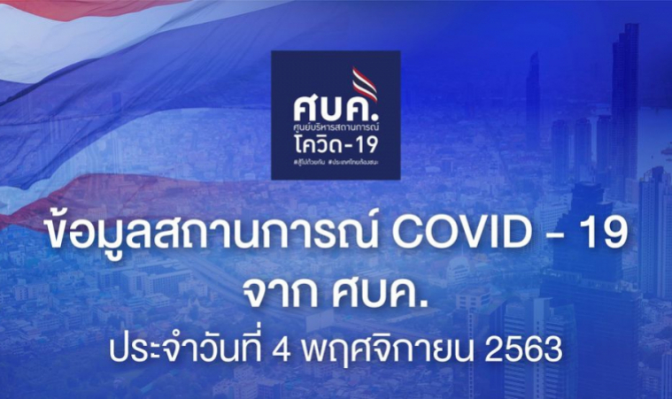 ศูนย์บริหารสถานการณ์โควิด-19 หรือ ศบค. เปิดเผยตัวเลขประจำวันที่ 4 พ.ย. 63 ว่า สถานการณ์ ปัจจุบันประเทศไทยอยู่อันดับที่ 147 ของโลก พบผู้ป่วยใหม่ 7 ราย ยืนยันผู้ป่วยสะสม 3,804 คน รักษาหายกลับบ้านแล้ว 3,612 คน รักษาอยู่ 133 คน และเสียชีวิตรวม 59 คน
