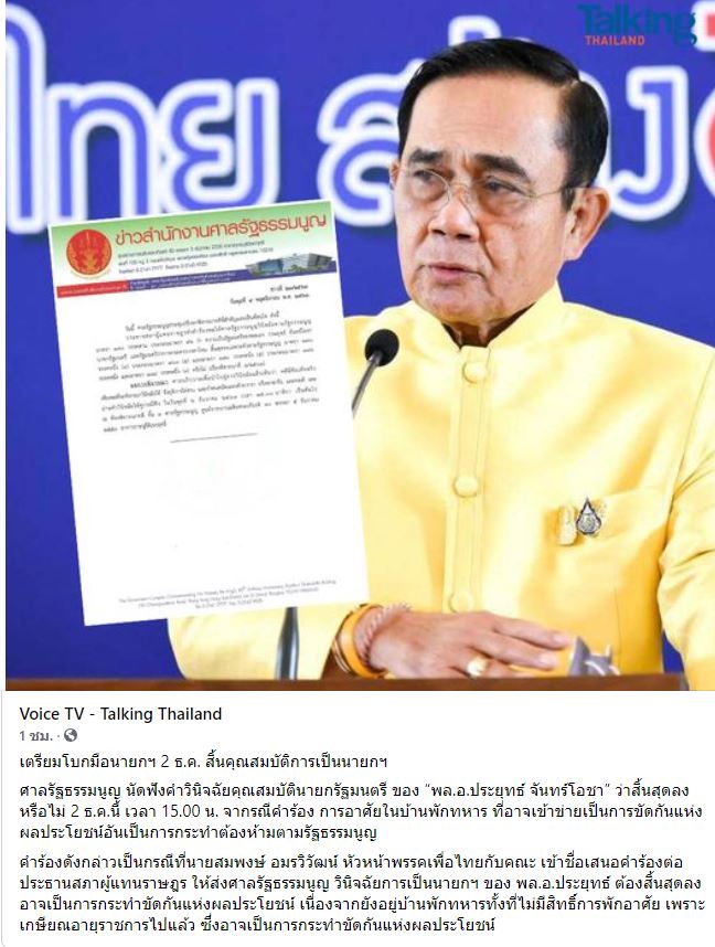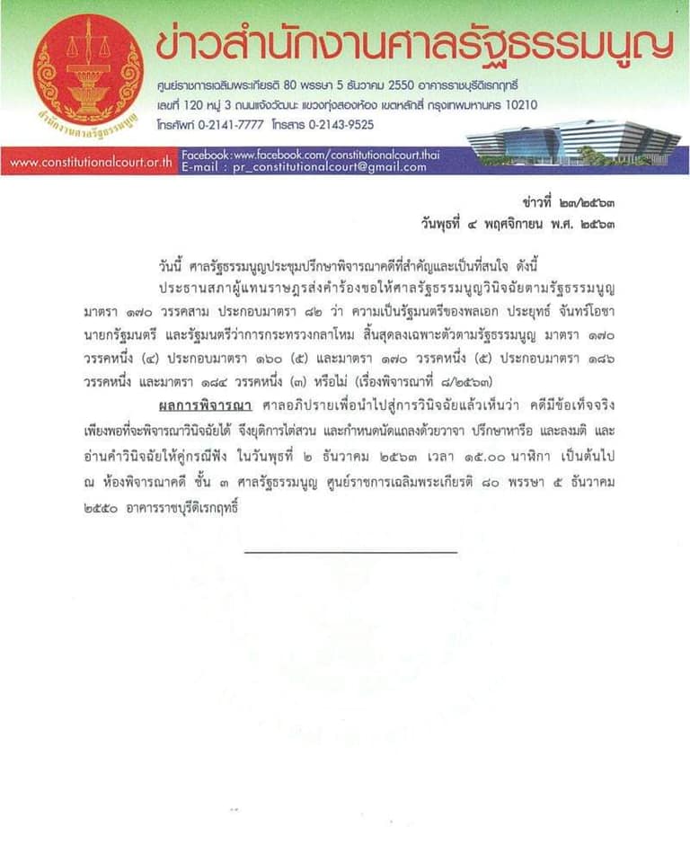 วันนี้ (4 พฤศจิกายน 2563) ศาลรัฐธรรมนูญได้เผยแพร่เอกสารนัดประชุมพิจารณาคำร้องของประธานสภาผู้แทนราษฎรวินิจฉัยตามรัฐธรรมนูญ มาตรา 170 วรรคสาม ประกอบมาตรา 82 ว่า ความเป็นรัฐมนตรีของ พล.อ. ประยุทธ์ จันทร์โอชา นายกรัฐมนตรี และรัฐมนตรีว่าการกระทรวงกลาโหม สิ้นสุดลงเฉพาะตัวตามรัฐธรรมนูญ มาตรา 170 วรรคหนึ่ง (4) ประกอบมาตรา 160 (5) และมาตรา 170 วรรคหนึ่ง (5) ประกอบมาตรา 186 วรรคหนึ่ง และมาตรา 184 วรรคหนึ่ง (3) หรือไม่ (เรื่องพิจารณาที่ 8/2563)