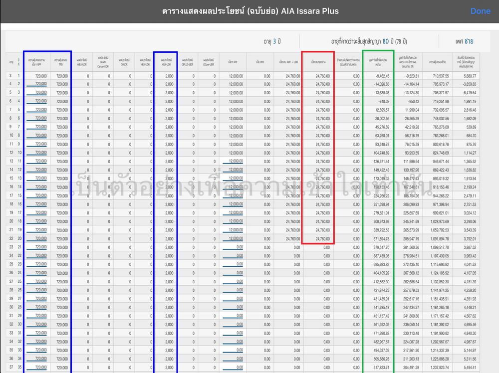 วางแผนการส่งเบี้ย : 20 ปี หลังจากนั้นหยุดจ่ายเบี้ยได้ ความคุ้มครองสุขภาพยังคุ้มครองอยู่เหมือนเดิมถึงอายุ 80 ปี หรือ ถ้าต้องการปิดบัญชีรับเงินคืนช่องที่ 4 จากขวามือในตารางเป็นตัวเลขประมาณการ
