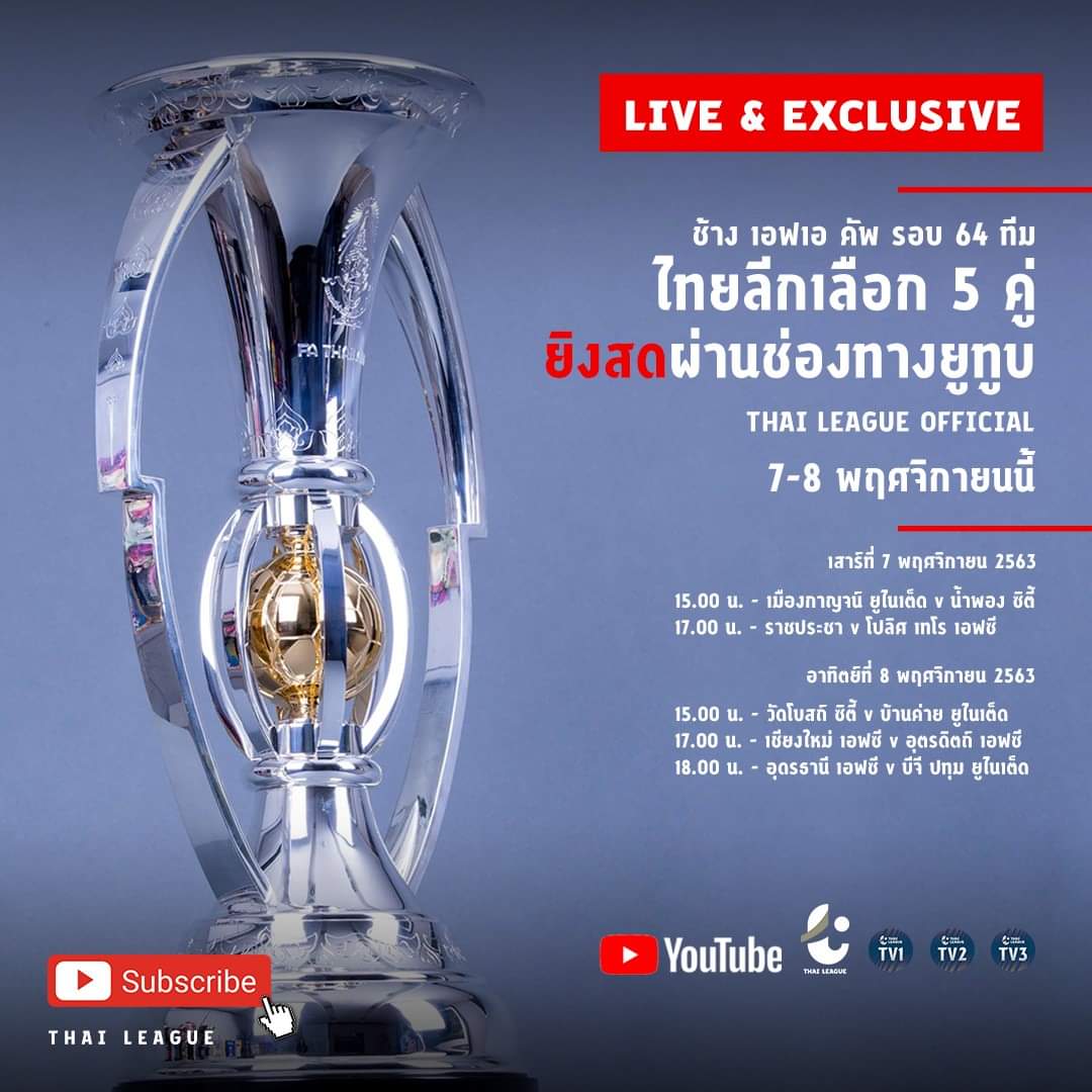 และวันเสาร์อาทิตย์นี้ จะมีการแข่งขันช้างเอฟเอคัพ รอบ 64 ทีมสุดท้าย จะมีการถ่ายทอดสด ให้ชมเกมการแข่งขัน 5 คู่ ทางช่อง YouTube อย่างเป็นทางการของไทยลีก