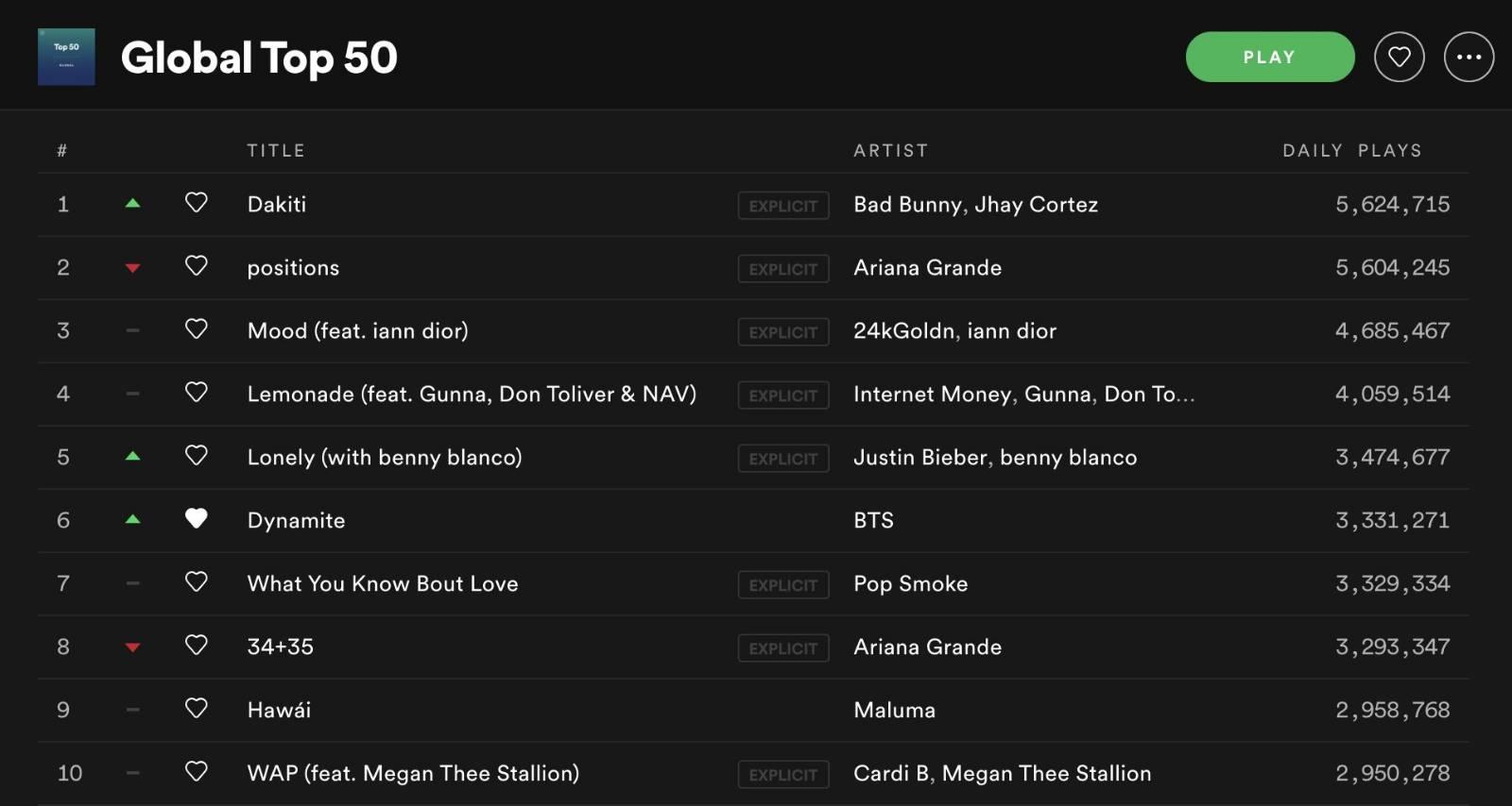"Dynamite" returns to the Top 6 of Spotify Global Chart on its 75th day of release!