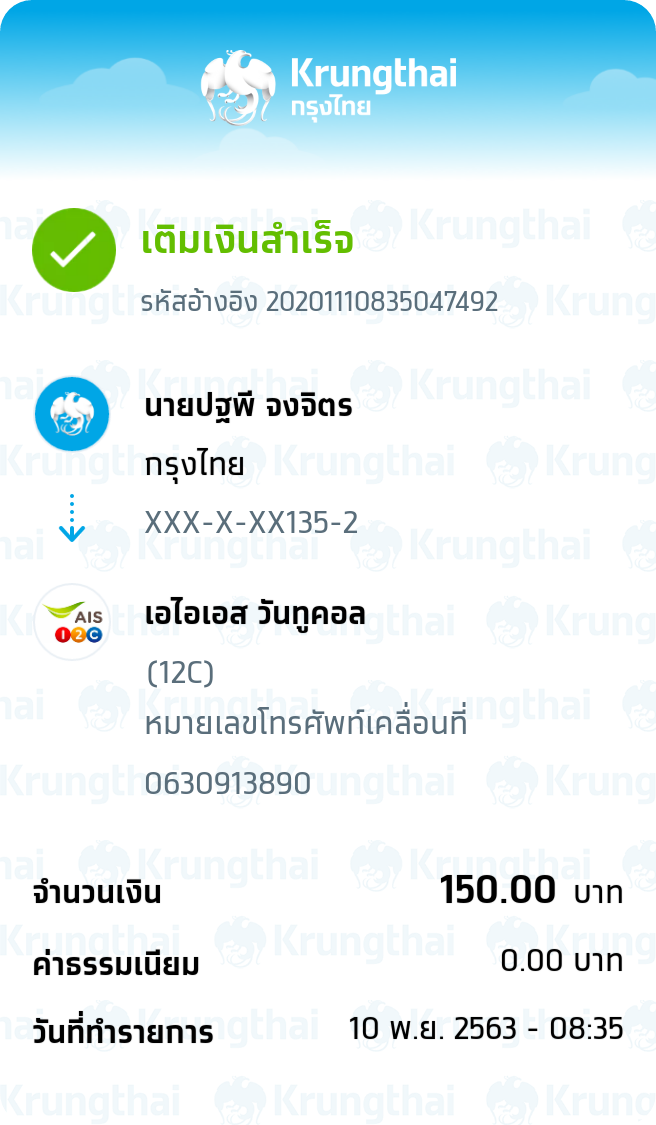 เบอร์ผิด0630913890เอไอเอสเบอร์ถูก0630918290เอไอเอสเติมเงินผ่านแอปกรุงไทยเวลา 07.35น. วันที่10/11/2563