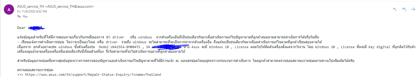 วันต่อมาผมยอมแพ้แล้ว จากประสบการณ์การทำงานที่ผ่านมา ลงมาเป็นร้อยเป็นพันเครื่องก้ปกติ หรือว่า เครื่องนี้มันจะใหม่เกินไป ผมคิดในใจเลยว่า ที่ 0 Asus เขาต้องทำได้แน่ๆ น่าจะมี Driver ที่คนทั่วไปไม่มี ผมเลยเล่าอาการ และสิ่งที่ลองทำให้ฟัง สรุปว่าที่ 0 รับเรื่องจะลง win10 ให้ใหม่ พรุ่งนี้มารับได้เลย 0 ที่ไปเป็น 0 ที่ฟอจูน
