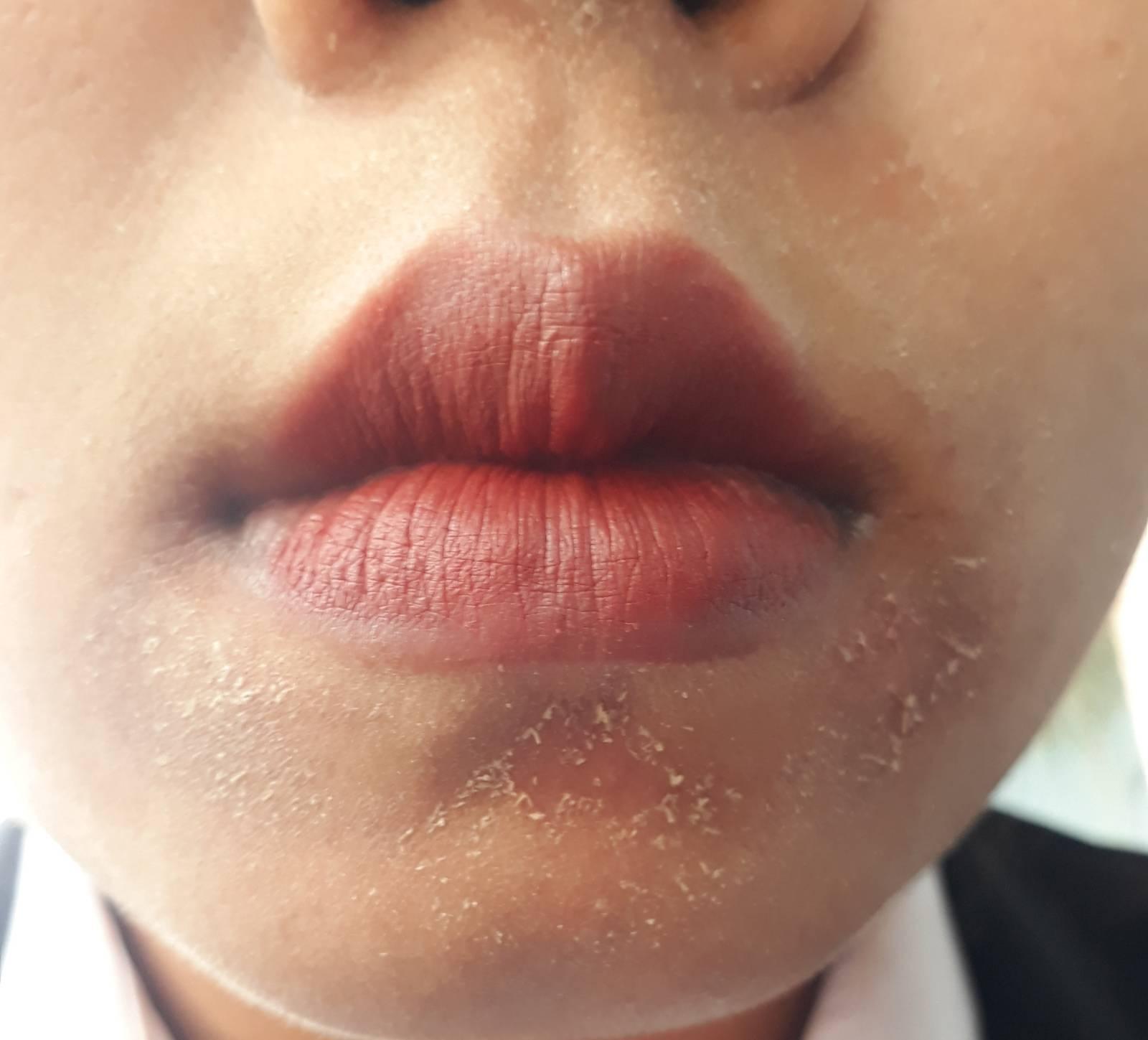 ผิวตรงมุมปากทั้งแห้งมากและคันมากค่ะ แถมยังมีรอยย่นด้วย คือก่อนหน้านี้ผิวตรงนั้นก็เป็นผิวนุ่ม ๆ ปกติค่ะ แต่พอมีสิวผิวก็แห้งนิดนึงค่ะ เพราะเป็นสิวเม็ดเล็ก ๆ ก็มีแดง ๆ คันธรรมดา แต่พอบีบสิวเสร็จ ผิวก็แย่