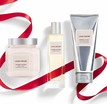 ชุดเซต Bath & Body ของ Laura Mercier สามชิ้นสุดหรูหรานี้ประกอบไปด้วย Almond Coconut Milk Soufflé Body Crème, Almond Coconut Milk Crème Body Wash, Almond Coconut Milk Eau de Toilette