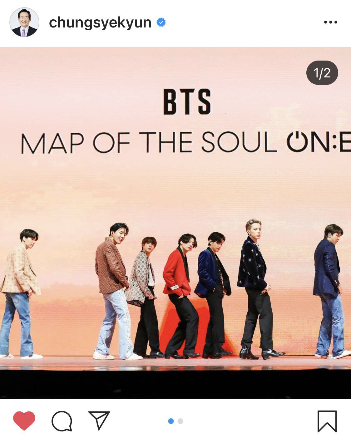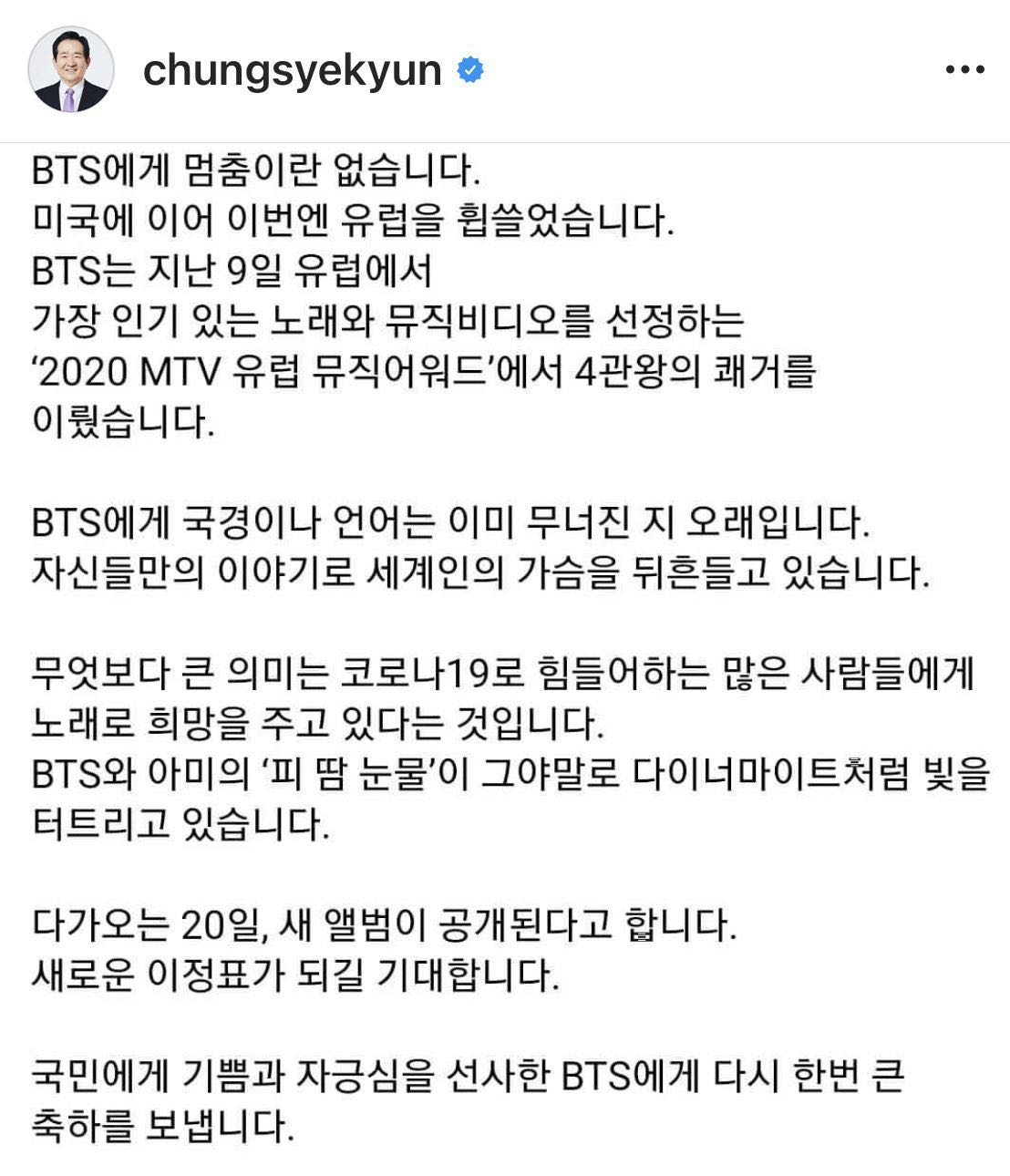 Chung Sye-kyun นายกรัฐมนตรีเกาหลีใต้โพสต์ข้อความแสดงความยินดีถึง BTS ใน IG ของเขา เนื่องจาก BTS ได้รับ 4 รางวัลจาก MTVEMA 2020