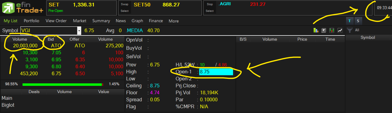 (เวลา 9.45 น.ราคากระพริบเปิดลดลงเหลือ 7.25 แต่วอลุ่ม bid จำนวน 20 กว่าล้านหุ้นยังอยู่)