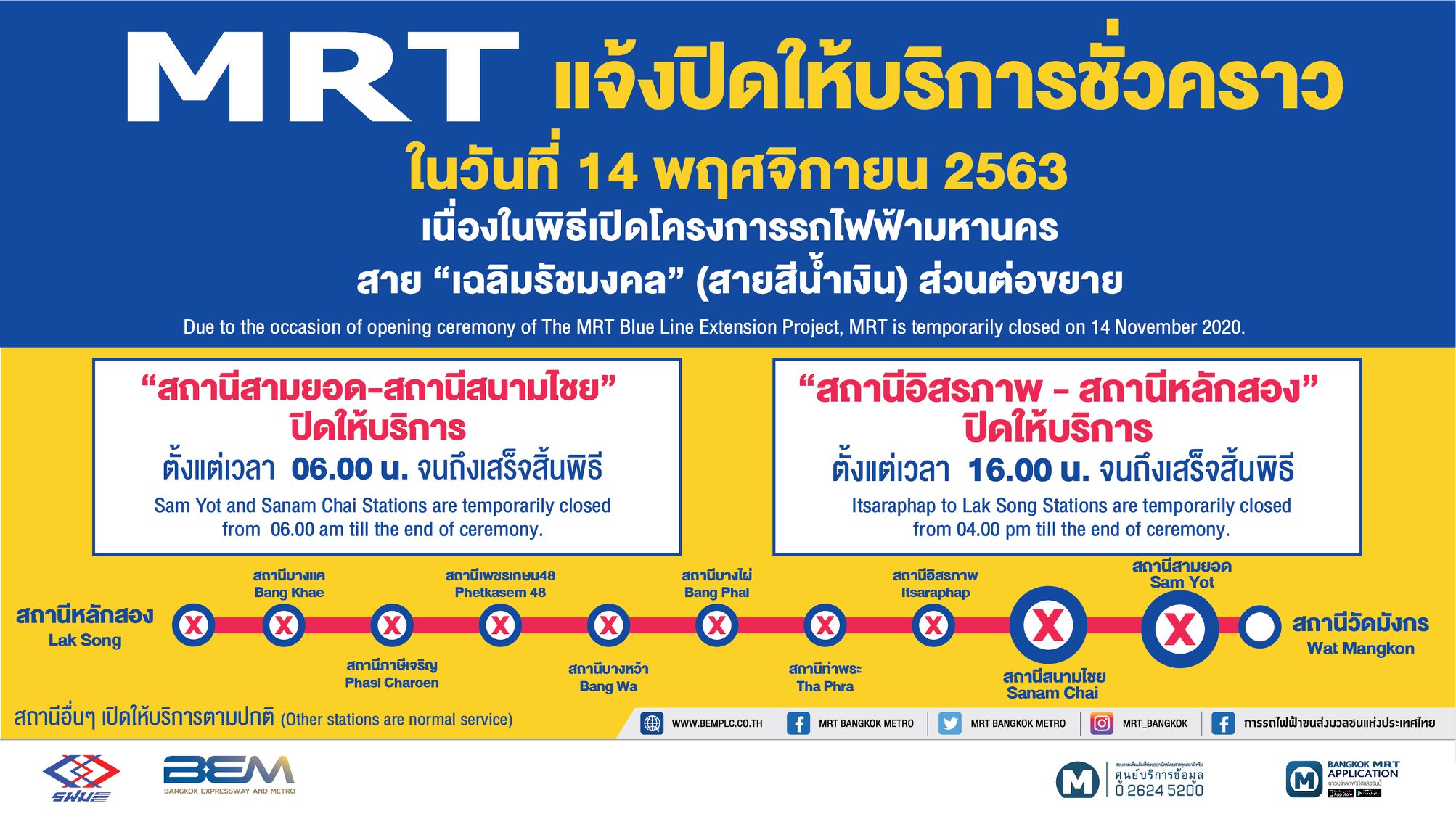 ปิดการใช้บริการ สถานีสามยอด สนามไชย อิสรภาพ หลักสอง รวม 4 สถานี ตั้งแต่เวลา 6 โมงเช้า และ 4 โมงเย็นครับ