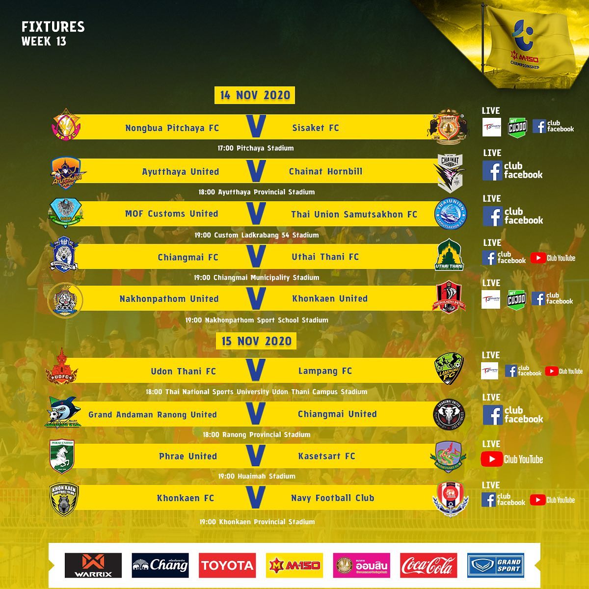 อีกคู่ที่น่าสนใจคือตอน 1 ทุ่มวันเสาร์ นครปฐม ศิษย์โค้ชธง ธงชัย เจอ ขอนแก่น ยู ศิษย์โค้ชซูงาโอะ คัมเบะ ที่ 5 เจอ ที่ 2  โค้ชไทยชื่อดัง เจอโค้ชญี่ปุ่น ใครจะได้สามแต้มไป คู่นี้เดือดแน่นอน