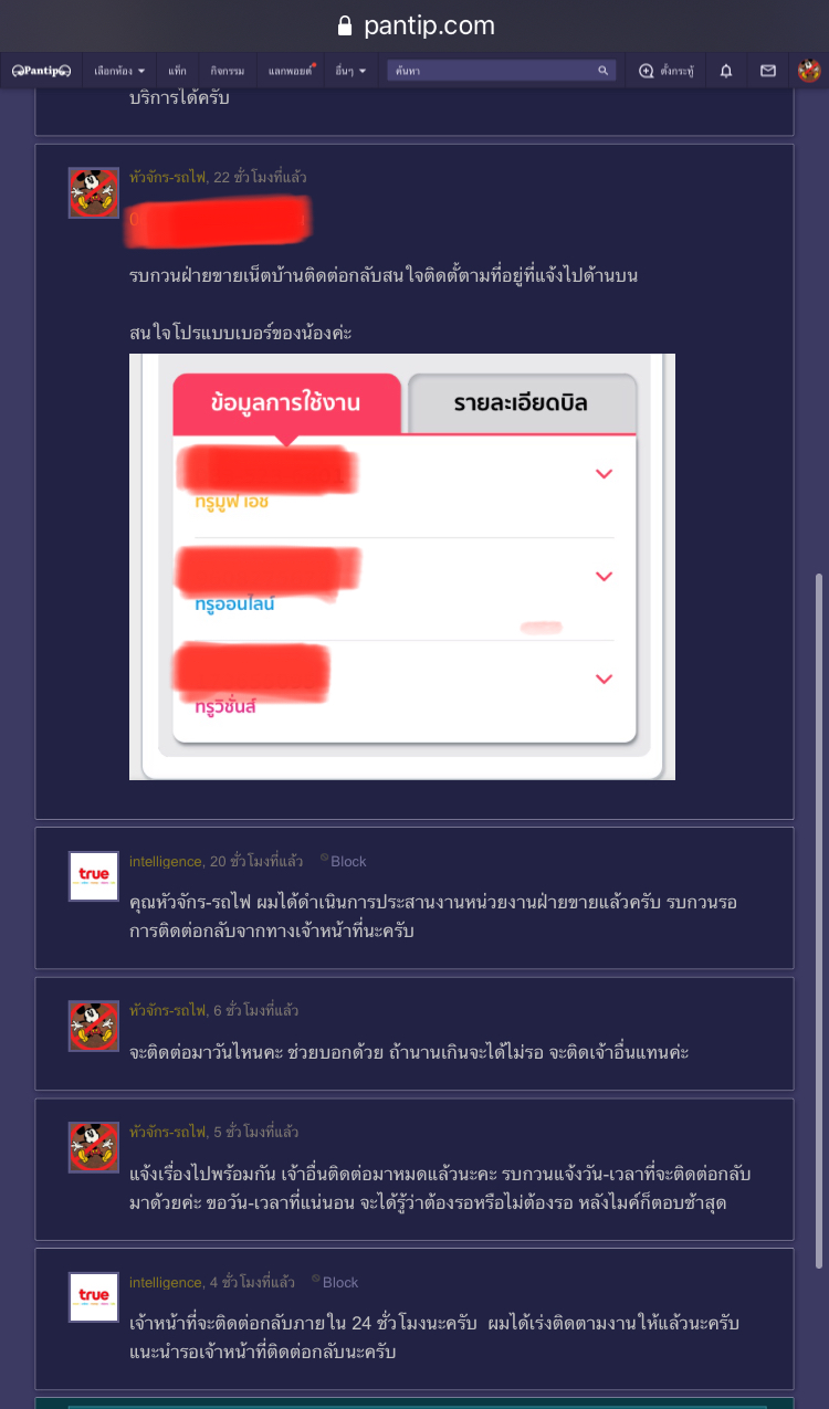 True ซึ่ง จนท. แจ้งว่า เซลจะติดต่อกลับภายใน 24 ชม. และก็แจ้งว่าจะเร่งด่วนให้ ซึ่งตอนนี้เหลืออีกไม่ถึง 2 ชม. จะครบแล้ว หากช้าสุดก็คงประมาณ 22.00 น. ซึ่งเวลานี้ก็คงไม่ควรแล้ว